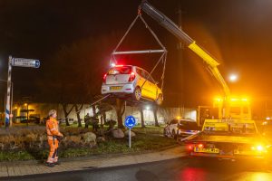 Een berger heeft de auto van de keien afgetild en geborgen.