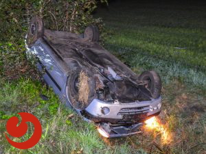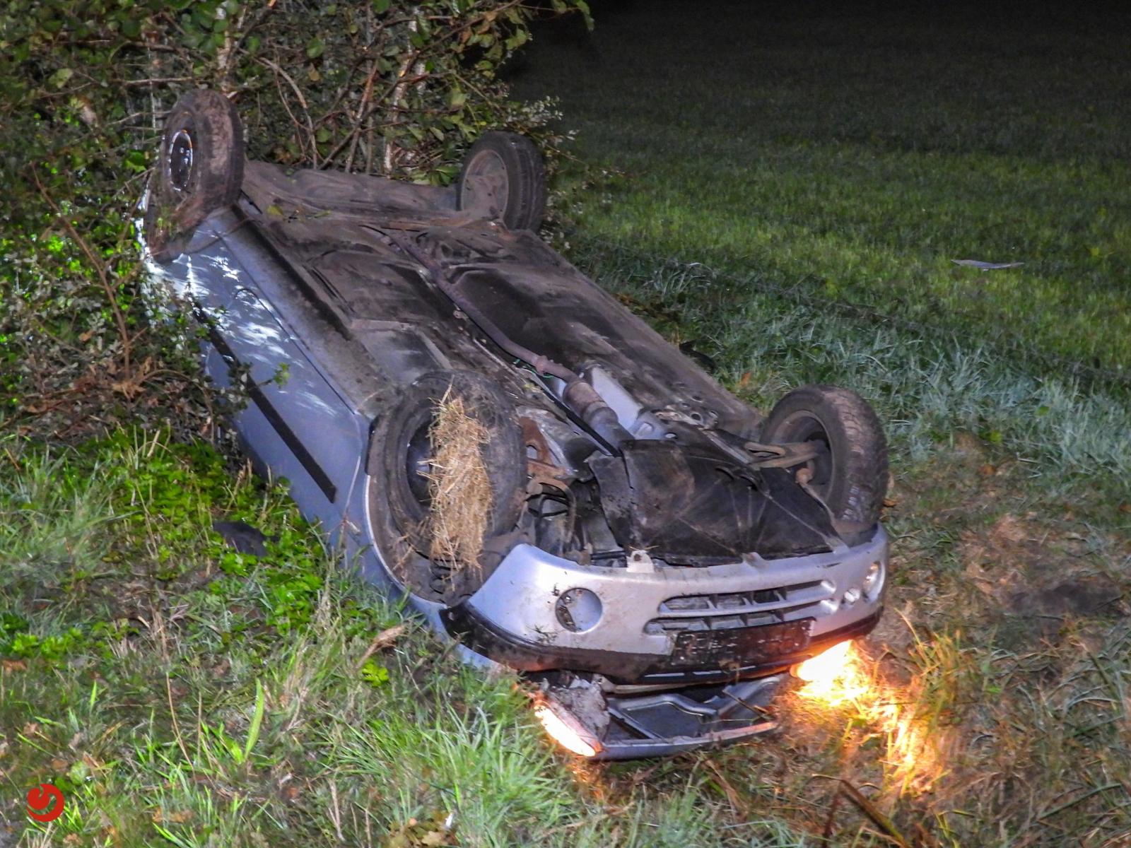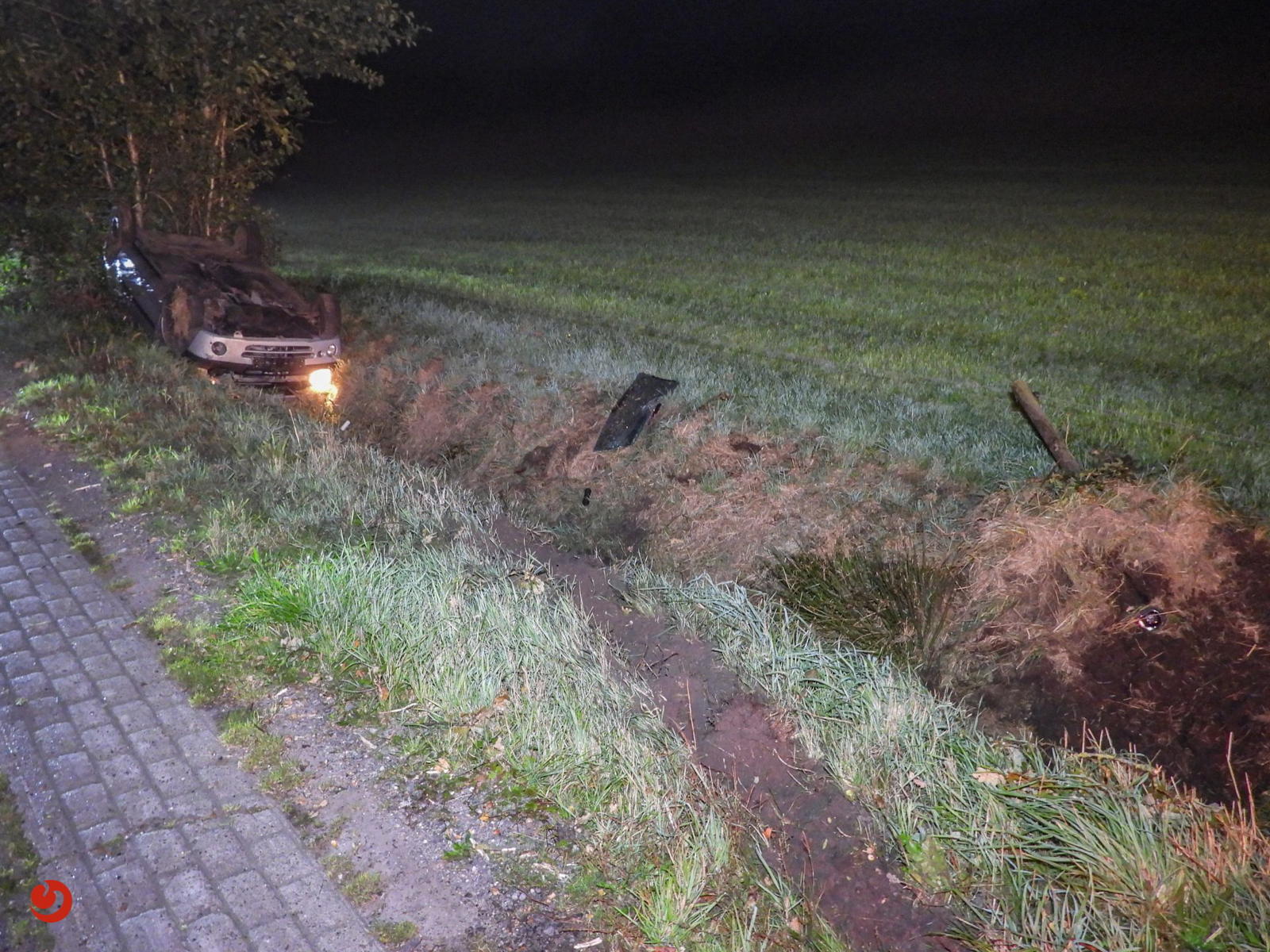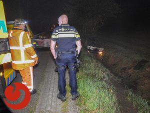 Rond kwart over negen ging het mis toen de bestuurder door onduidelijke oorzaak de macht over het stuur verloor. De auto raakte in de berm, raakte daar een paaltje en eindigde op de kop in een greppel naast de weg tot stilstand.