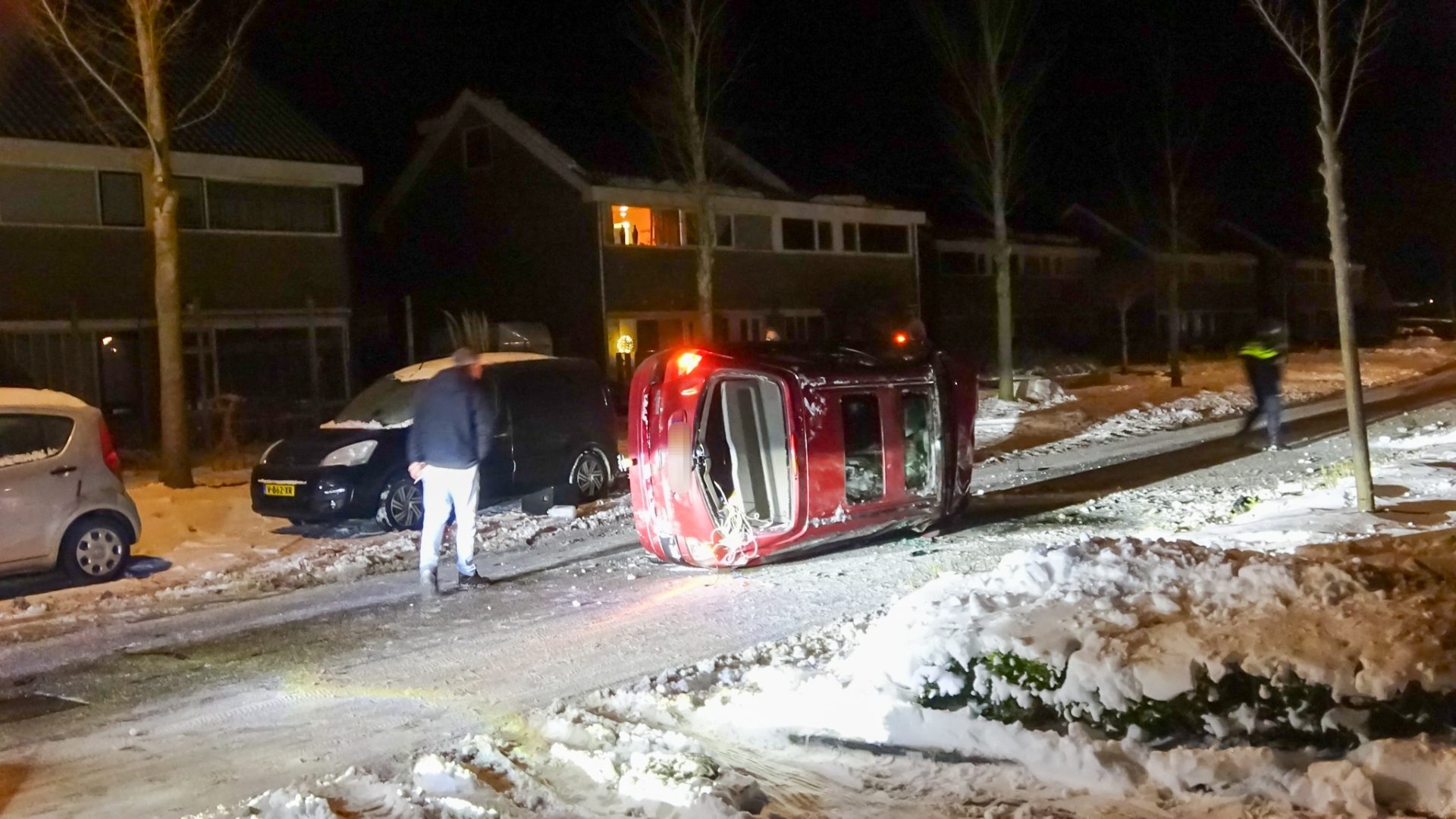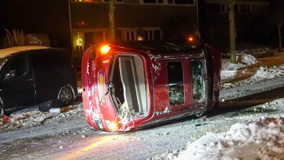De bestuurder van een Renault verloor in de 30-kilometerzone vermoedelijk door een te hoge snelheid en een glad wegdek de macht over het stuur. In een lichte knik in de weg schoof het voertuig door en botste tegen een lantaarnpaal, waarna de auto op de zijkant midden op de rijbaan tot stilstand kwam. De lantaarnpaal raakte door de aanrijding volledig vernield.