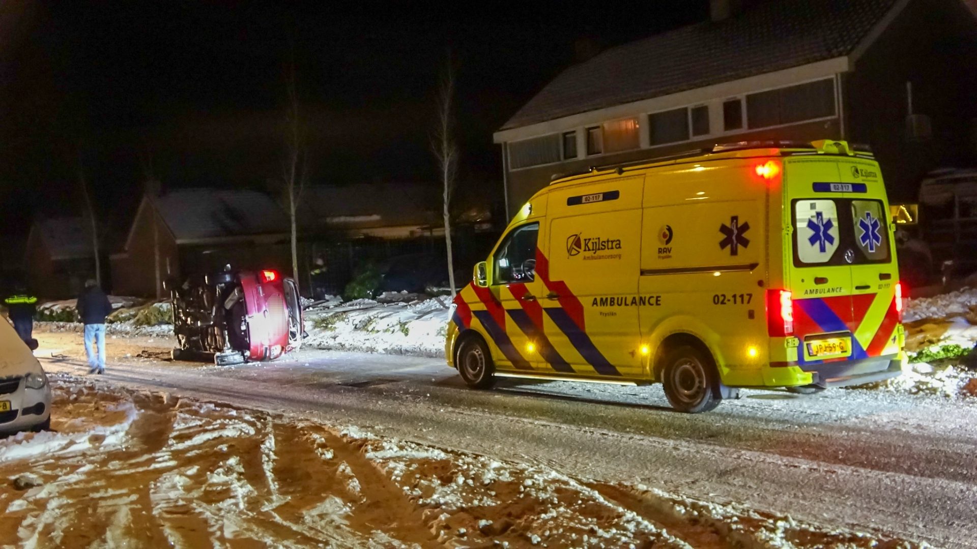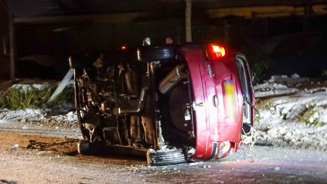 Politie en ambulance kwamen met spoed ter plaatse om hulp te verlenen aan het slachtoffer. De brandweer werd opgeroepen om het voertuig na te kijken en heeft de auto gestabiliseerd. Met behulp van spreid gereedschap is de Renault weer op zijn wielen gezet.
