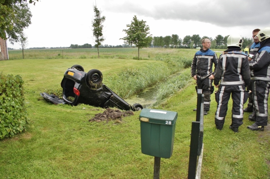 De auto, komende uit de richting van Menaldum, is na de bocht met de wielen in de linkerberm gekomen, na een stuurcorrectie is de auto rechts in de sloot beland en over de kop geslagen. Bij aankomst van de hulpdiensten waren de slachtoffers al uit het voertuig. Wonder boven wonder kwamen beide inzittenden met de schrik vrij, het ambulance personeel heeft beide personen ter controle in de ambulance onderzocht.