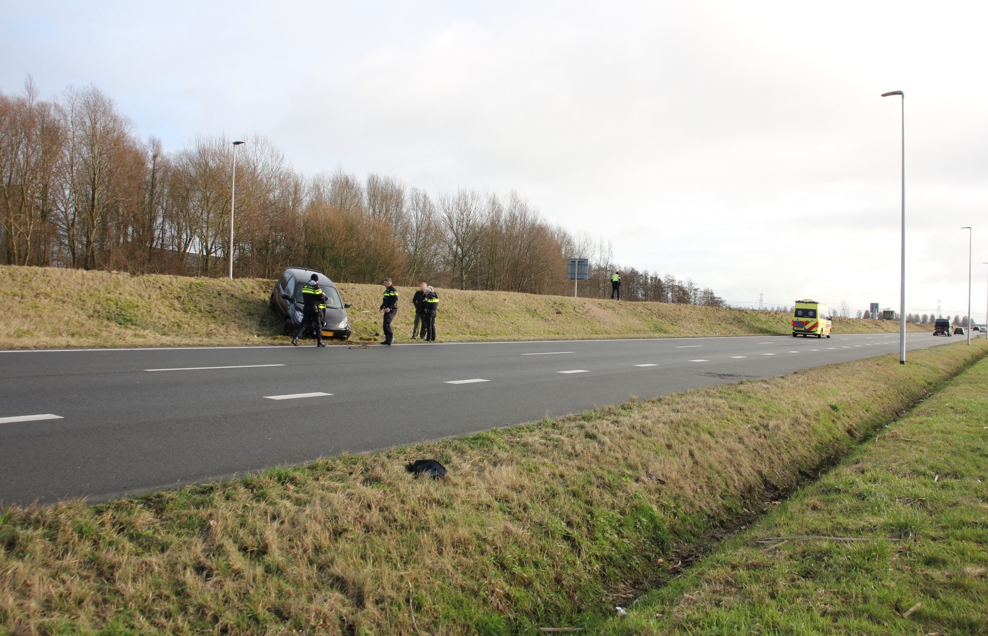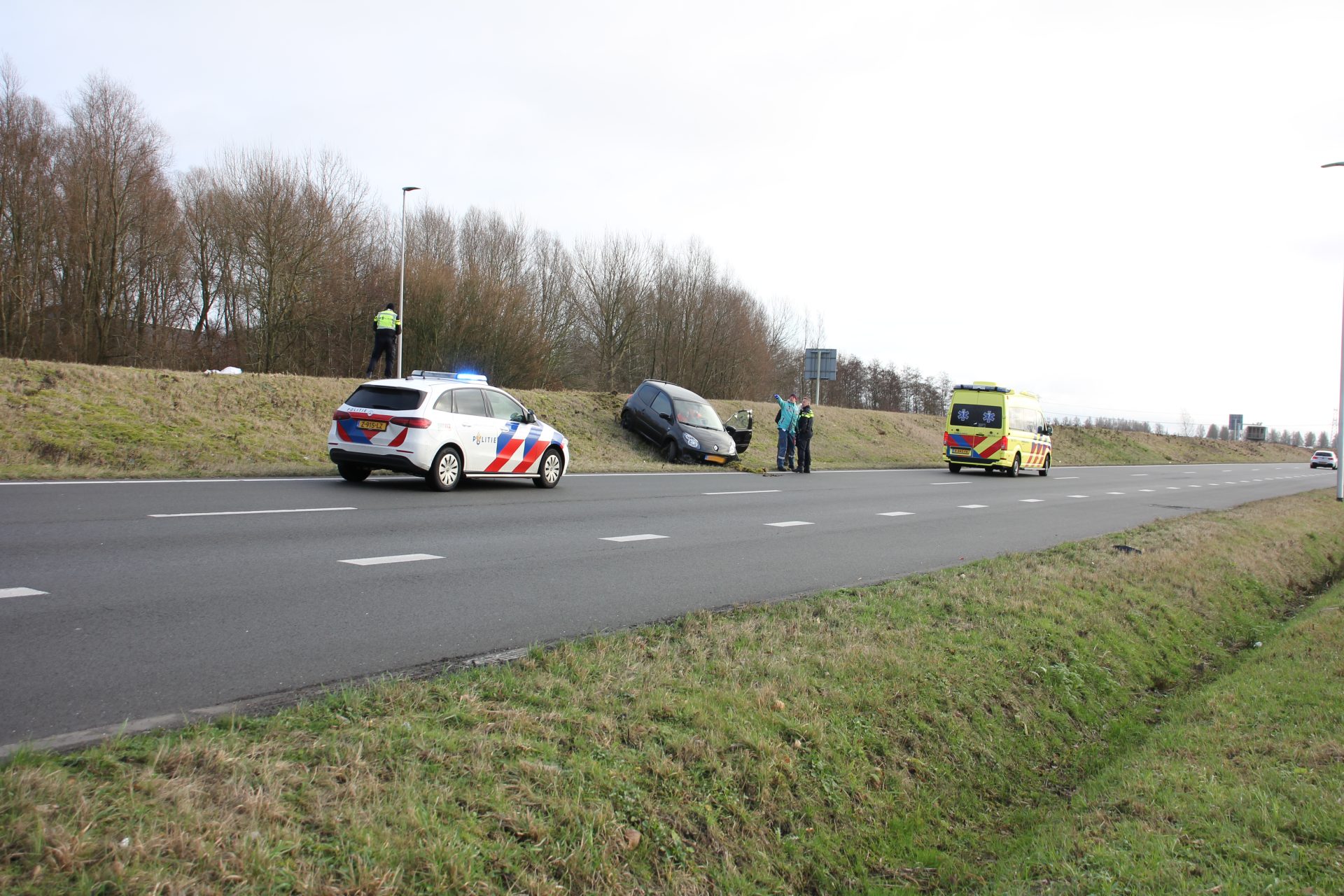 Omstreeks twee uur raakte een automobilist(e) de controle over het stuur kwijt en schoot vervolgens over de geluidswal in het midden naar de andere kant, waar de auto tot stilstand kwam. De inzittenden zijn gecontroleerd door ambulancepersoneel, maar raakten niet gewond.