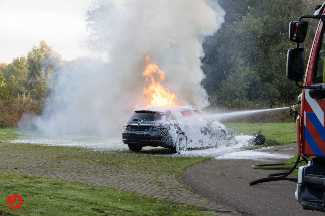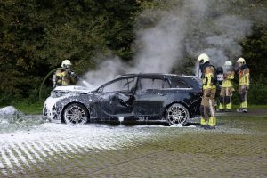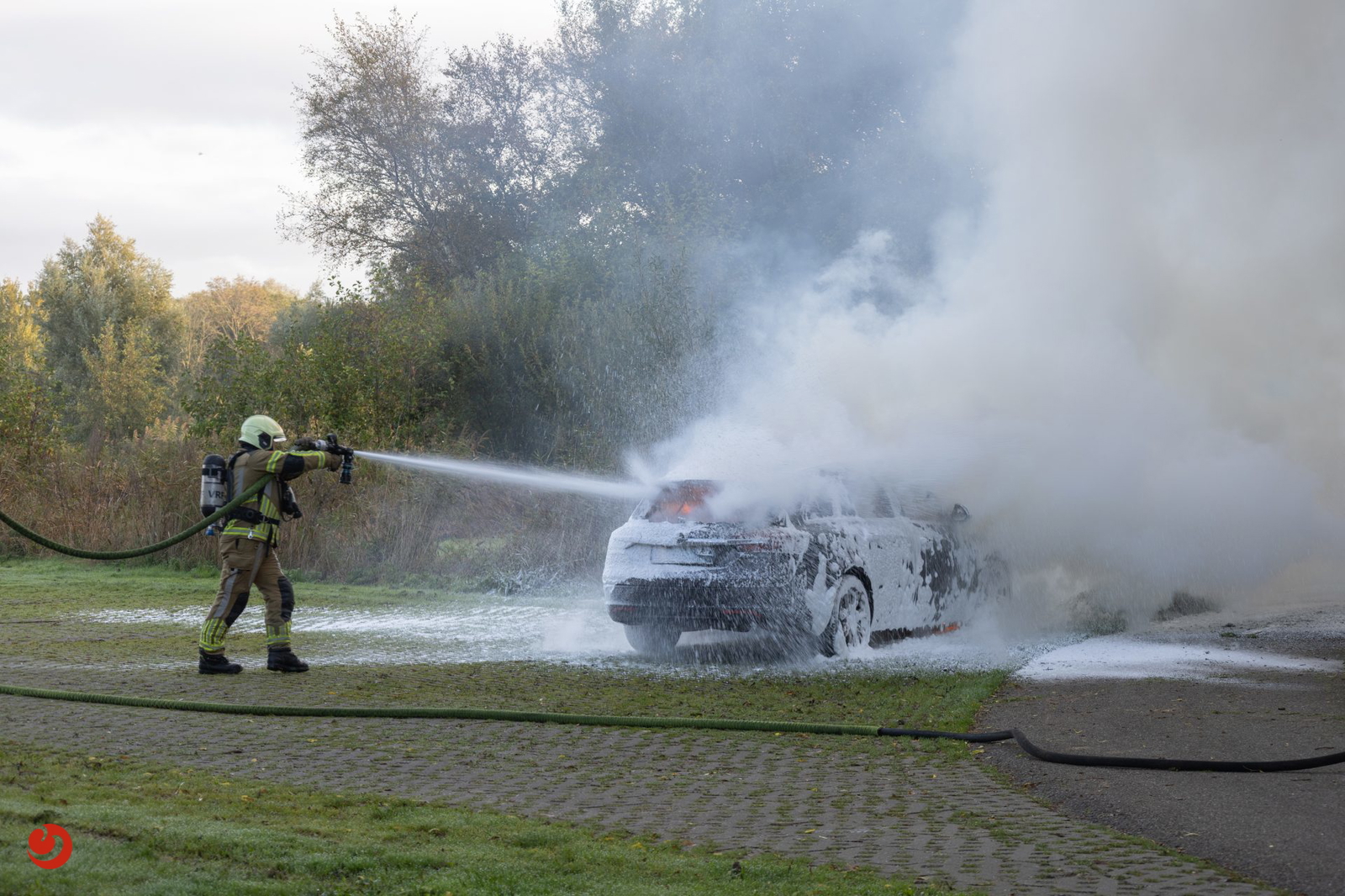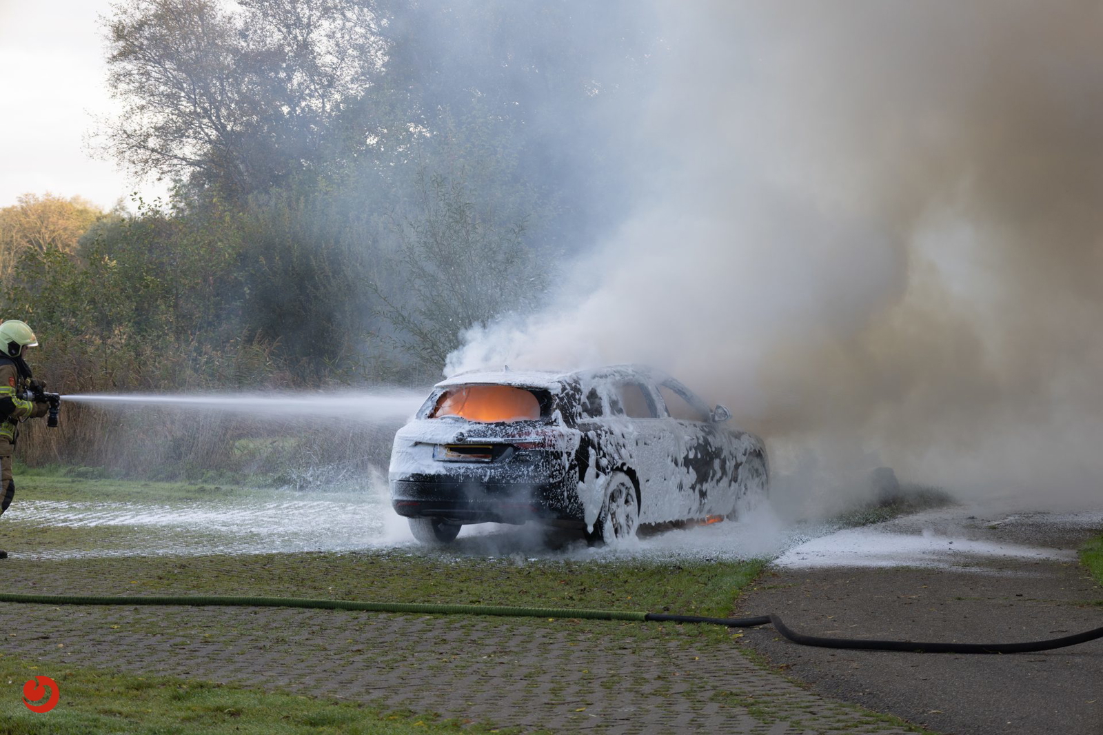 Met blusschuim was het vuur snel onder controle, maar de auto was niet meer te redden. De oorzaak van de brand is onduidelijk.