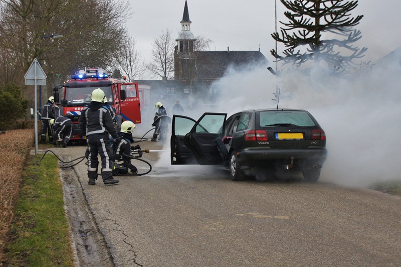 Bij aankomst stond het motor compartiment van een Volvo in brand. De brandweer heeft de brand geblust, maar kon niet meer voorkomen dat de auto totaal verwoest is. De inzittenden konden tijdig het voertuig verlaten. Een berger heeft de auto weggesleept.