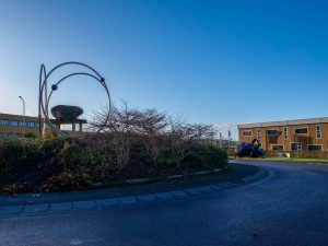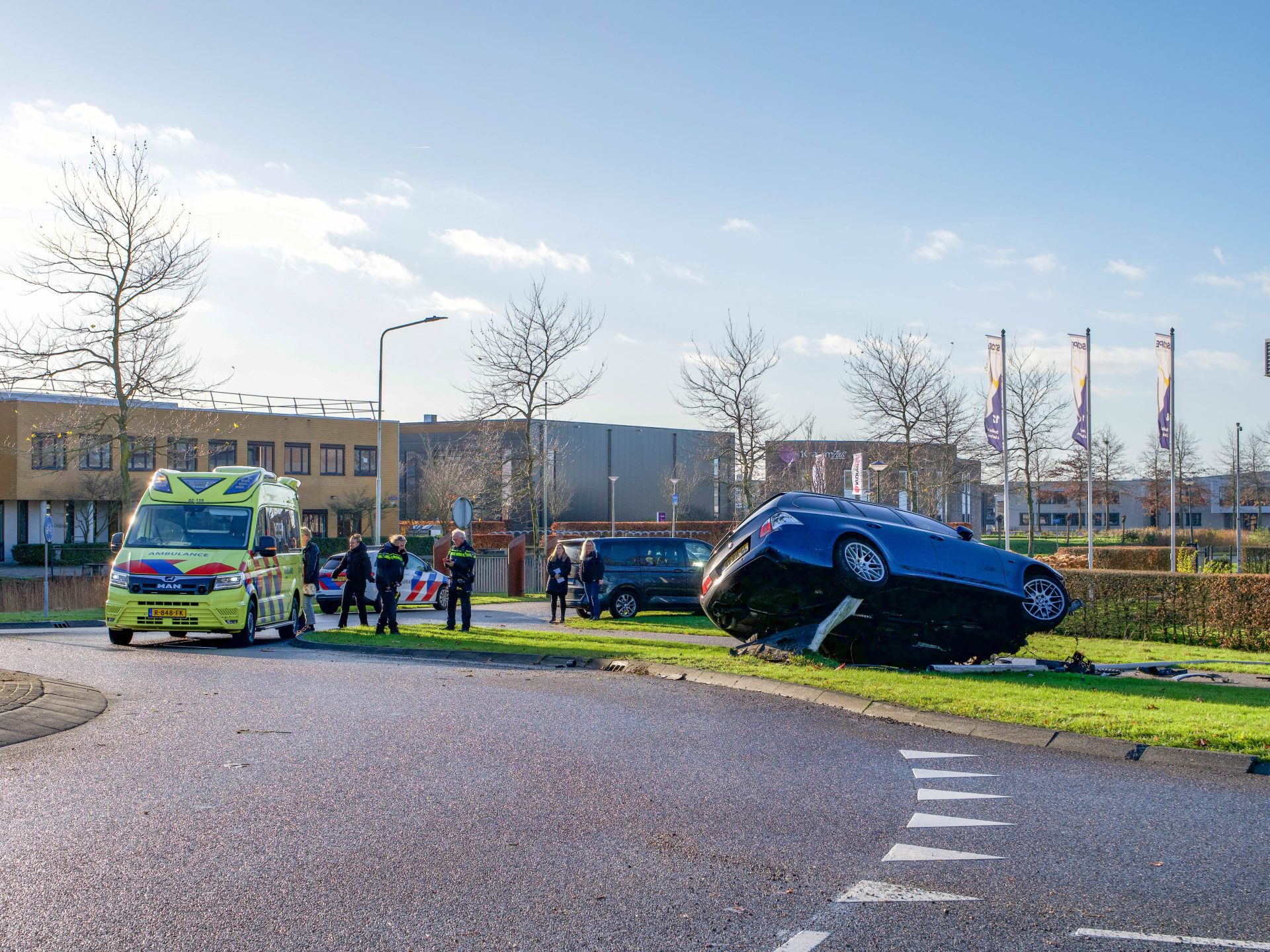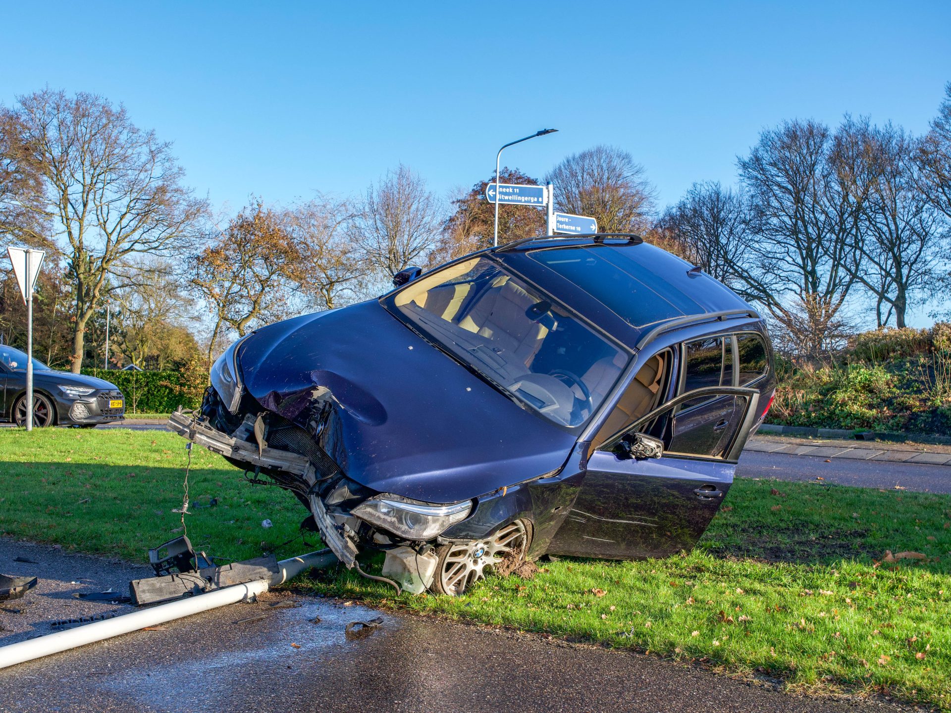 Omstreeks 10:00 uur raakte een bestuurder de macht over het stuur kwijt, vloog recht over de rotonde en kwam tot stilstand bovenop een lantaarnpaal. De bestuurder is behandeld door ambulancepersoneel maar vervoer naar het ziekenhuis bleek niet nodig te zijn.