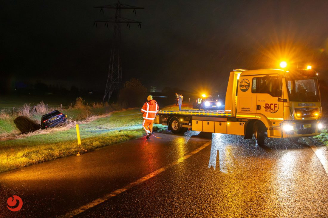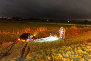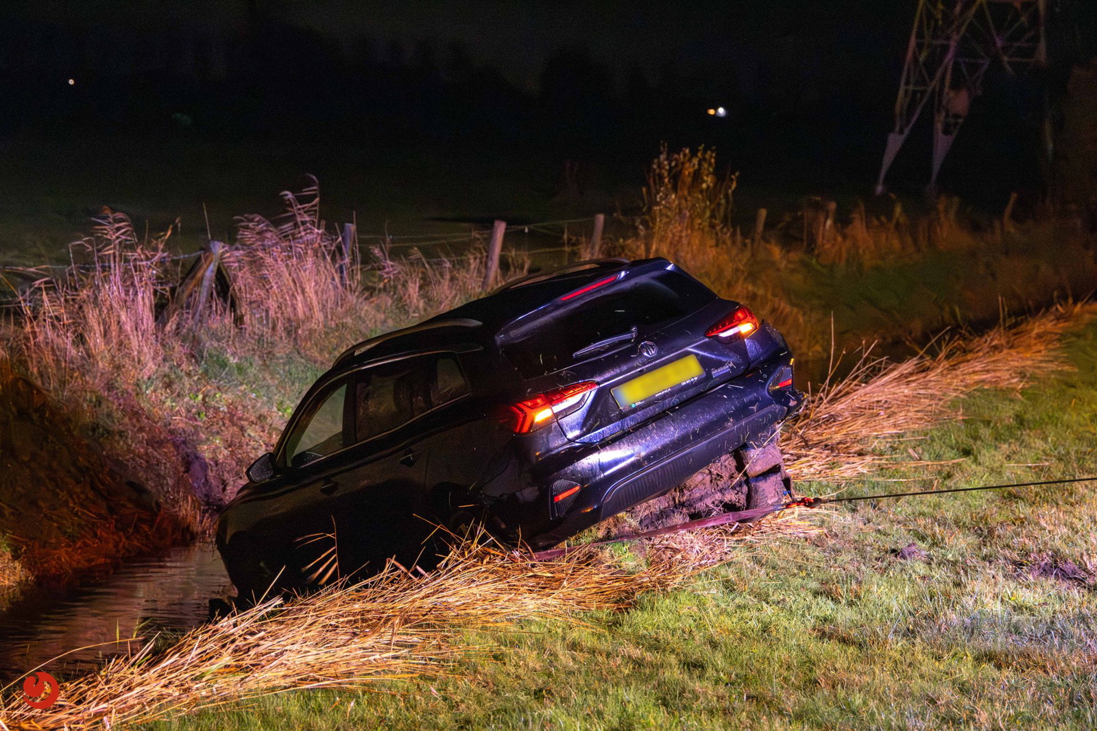 Even voor 23:00 uur ging het mis op de toerit naar de A7 richting Joure. De bestuurder schatte naar zijn eigen zeggen de bocht verkeerd in, raakte in de slip en kwam naast de weg in een sloot tot stilstand.