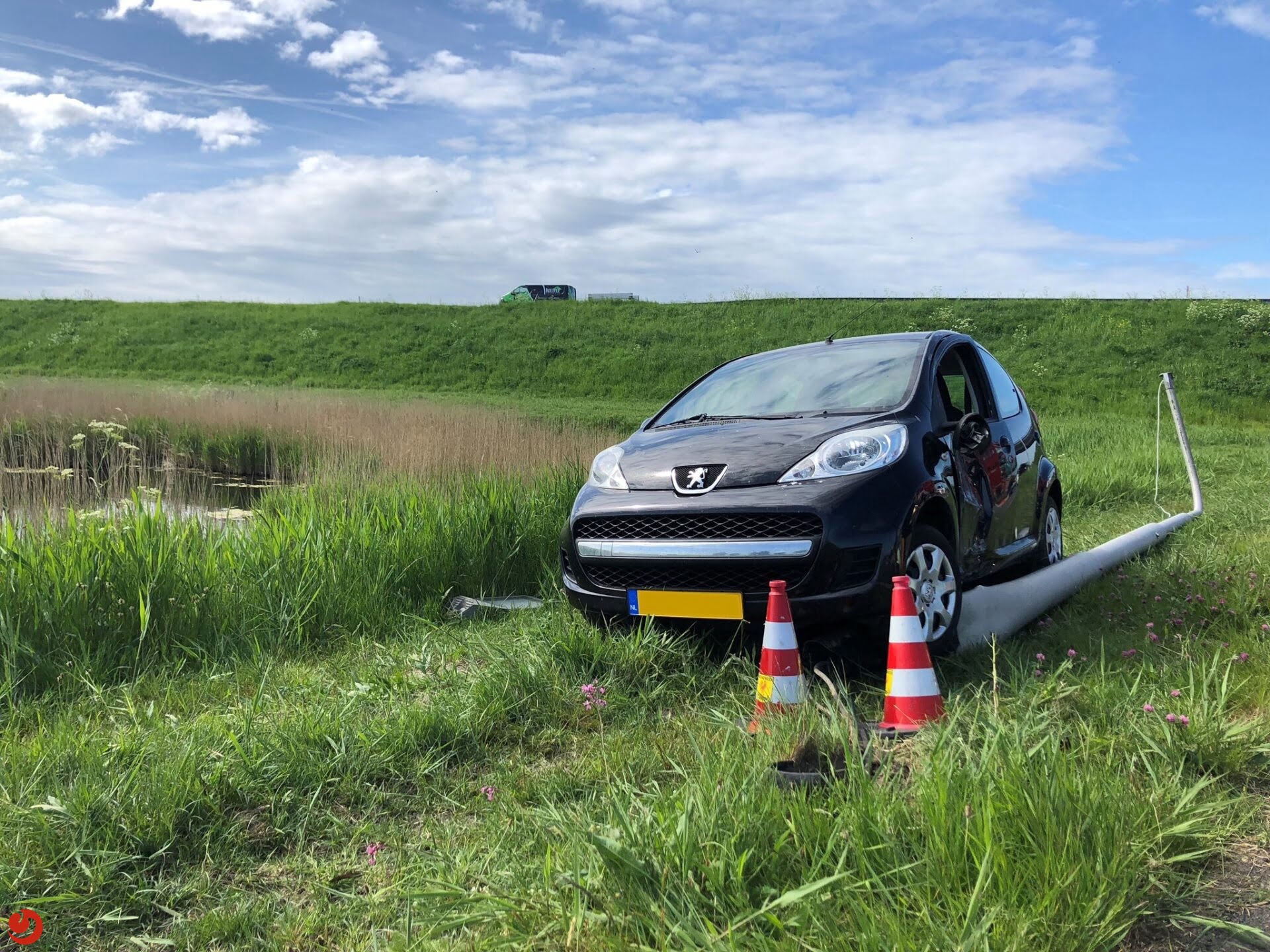 In wesp yn’e auto. Skrikke, rút iepen en dan gjit it mis. Ferskate 360’s oer de dyk. Lokkich bedarre de auto ‘feilich’ yn de berm, waard it net skept troch tsjinkommend ferkear en wie de lantearnpeal de redding foar op de kop yn it wetter. #Winsum #branwacht #Wommels #brandweer pic.twitter.com/AwUoGP7vo5