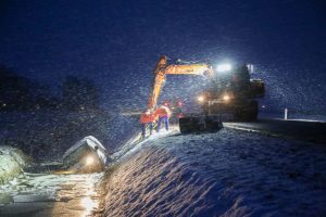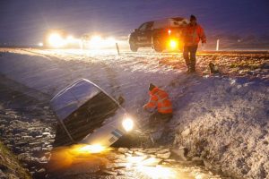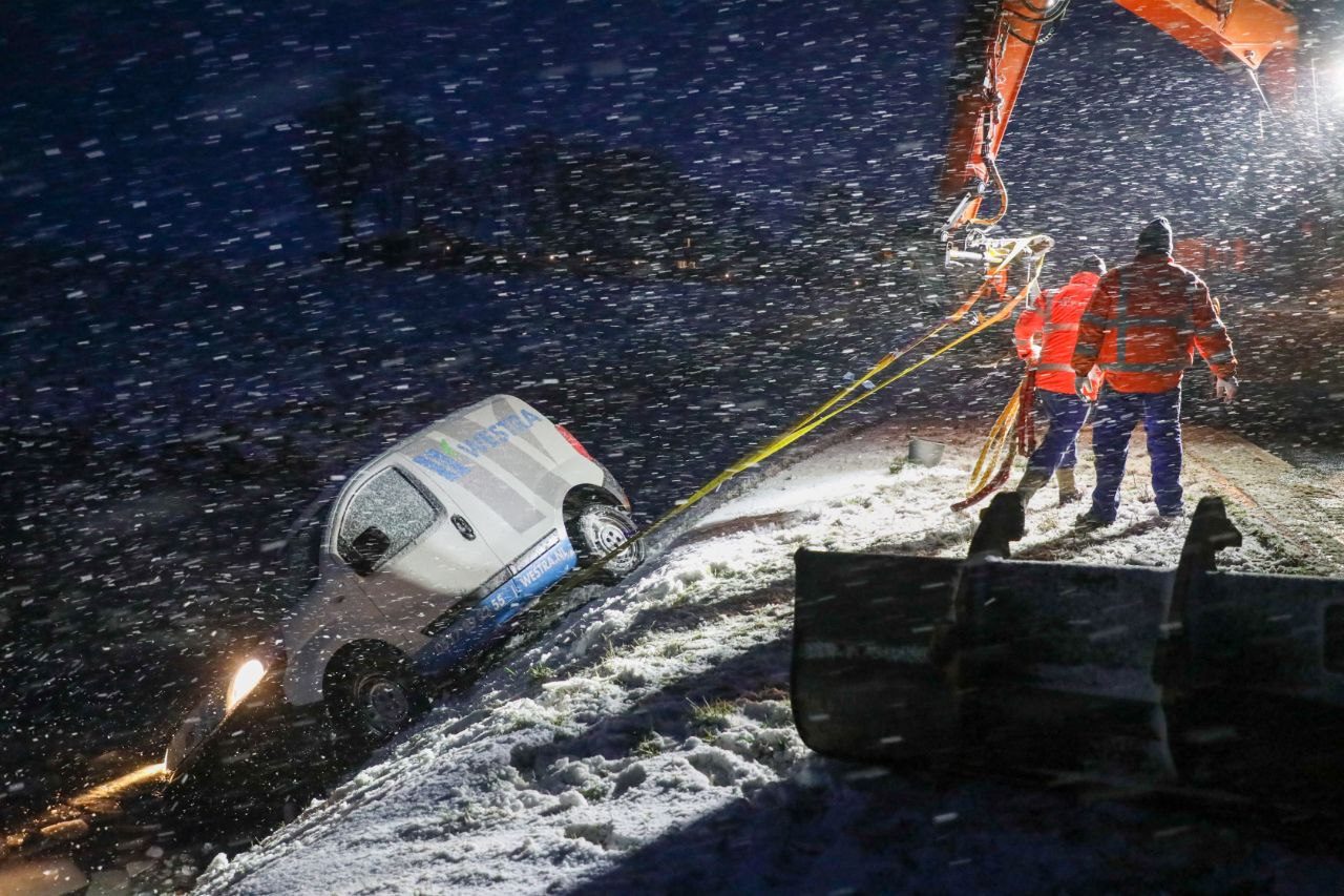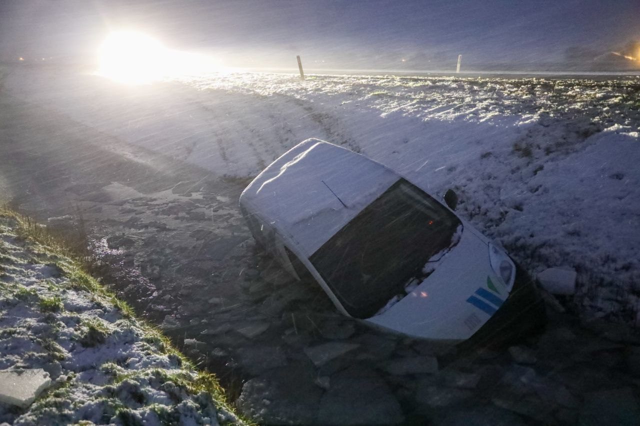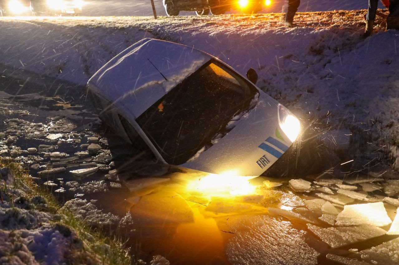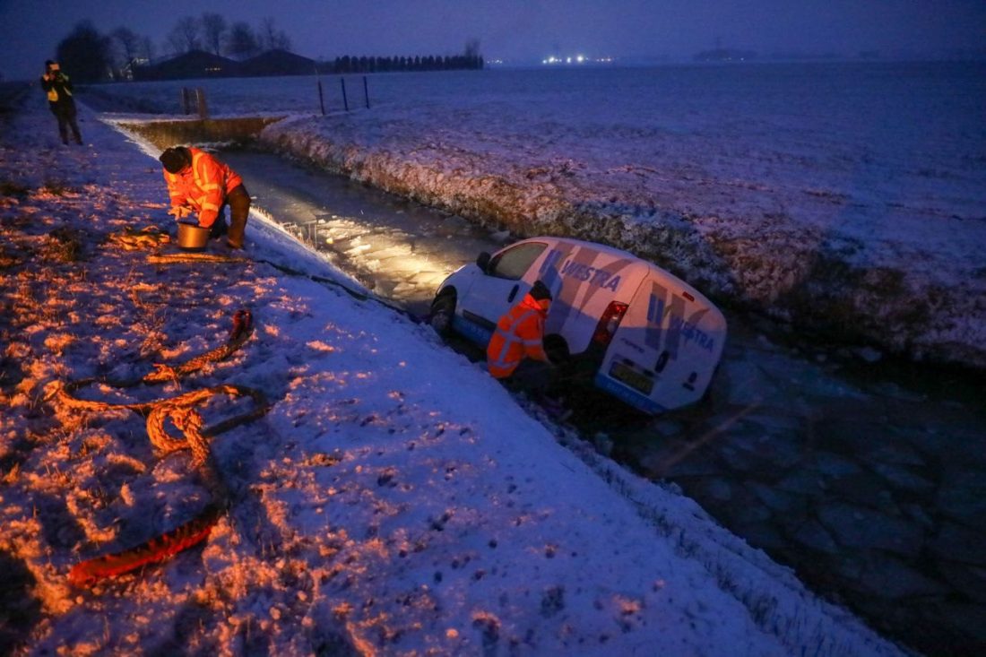 Het ongeval gebeurde omstreeks half acht tijdens flinke sneeuwval. De bestuurder kon uit het voertuig worden geholpen. Met een graafkraan is de bestelbus uit de sloot getrokken.