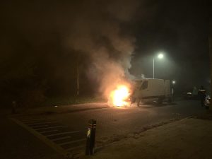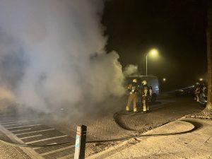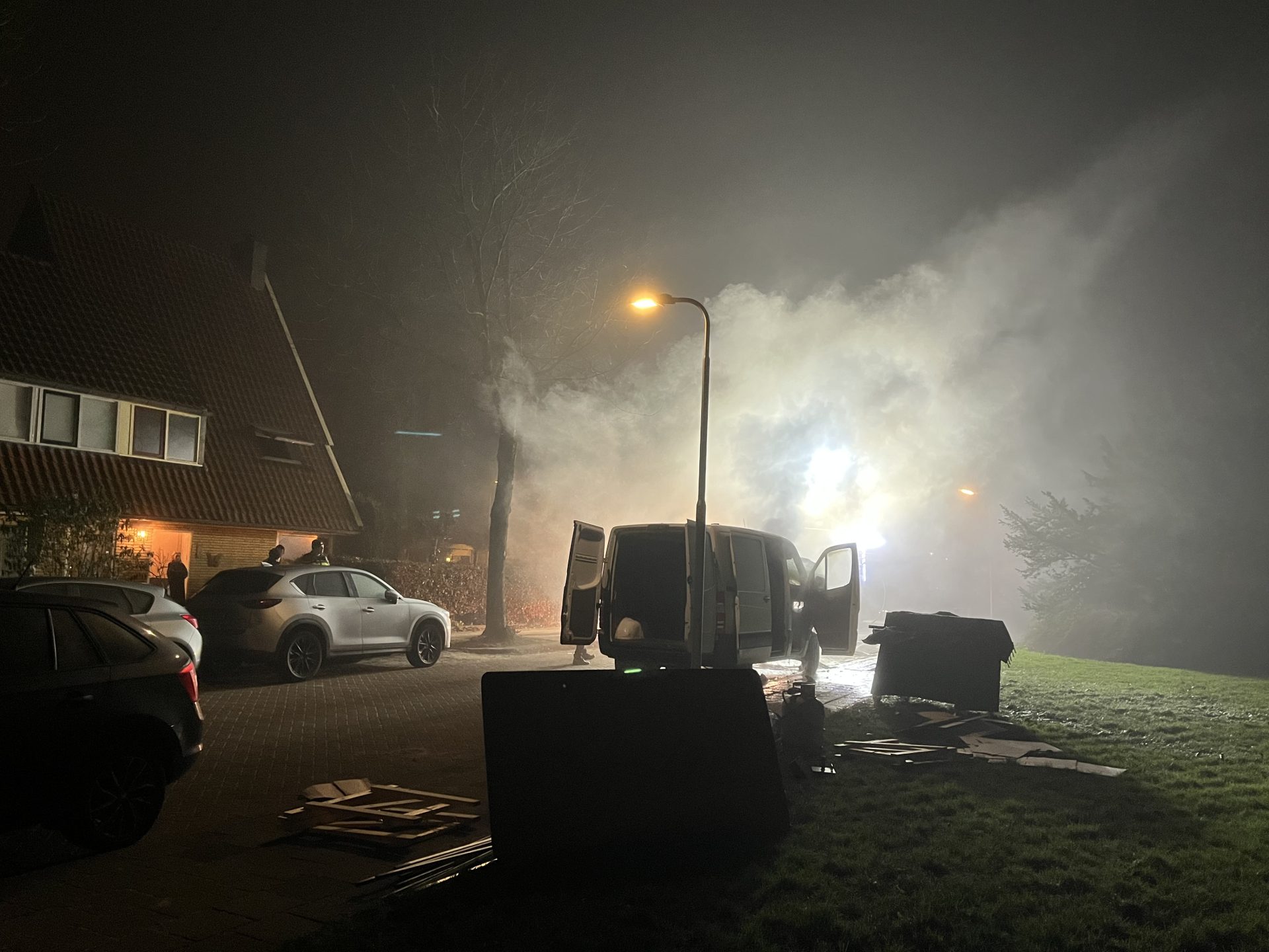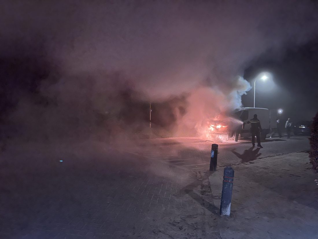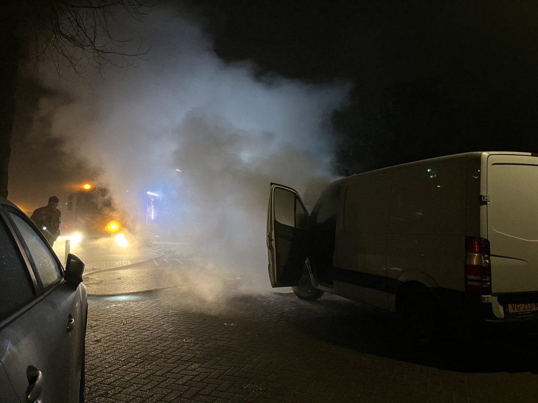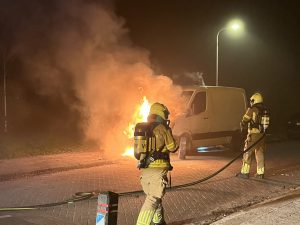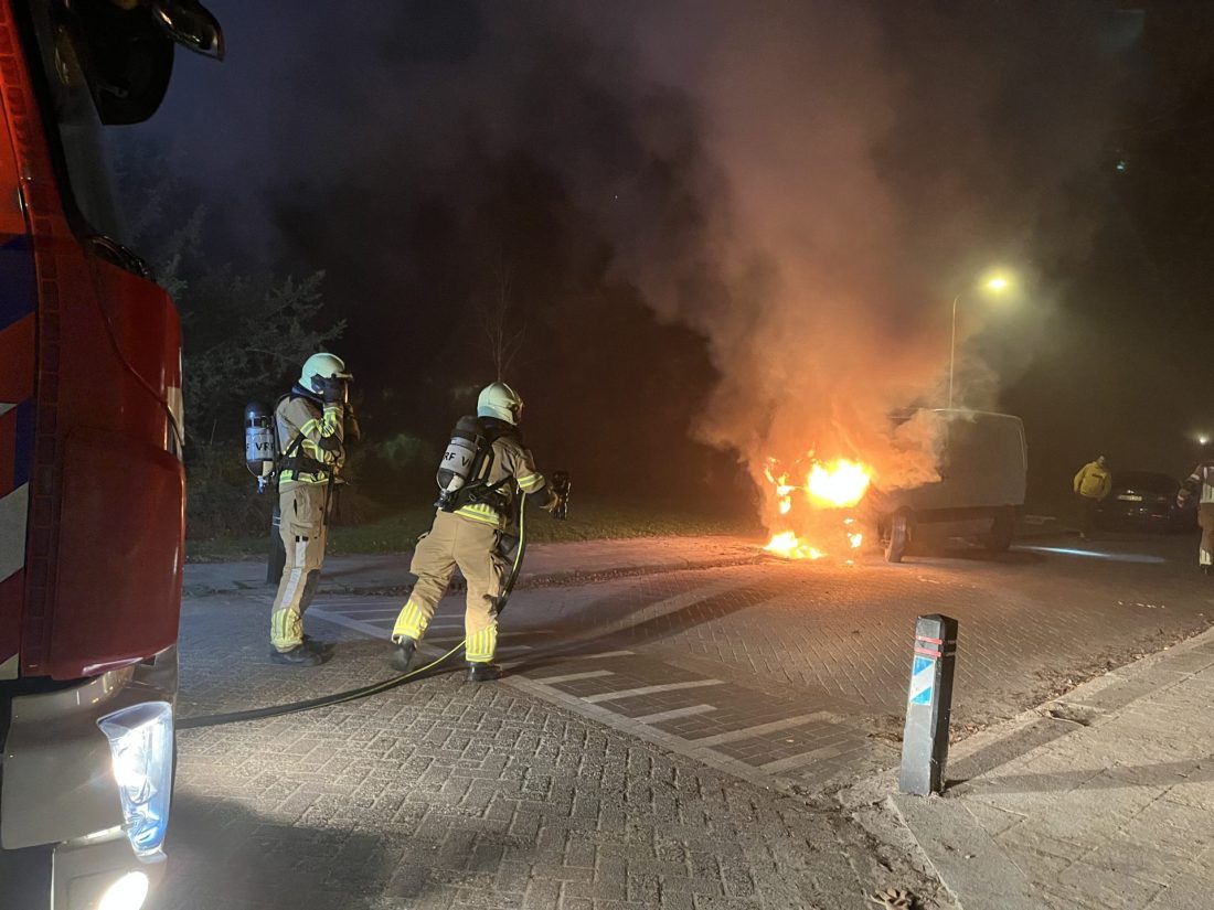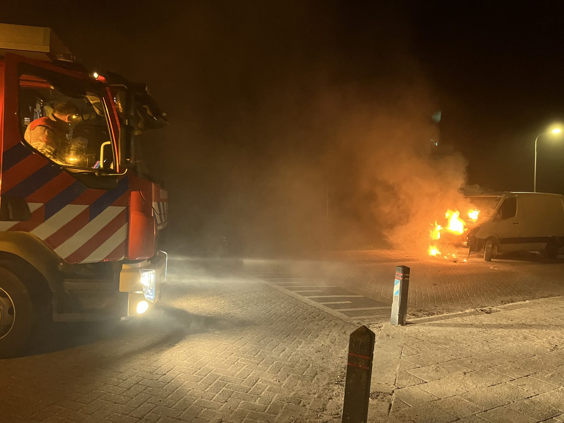 Rond 1:45 uur gingen brandweer en politie met spoed ter plaatse en troffen een bestelbus aan die van voren al in lichterlaaie stond.