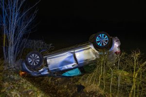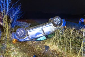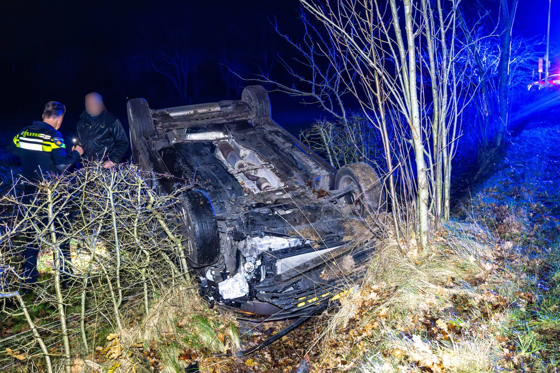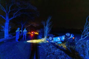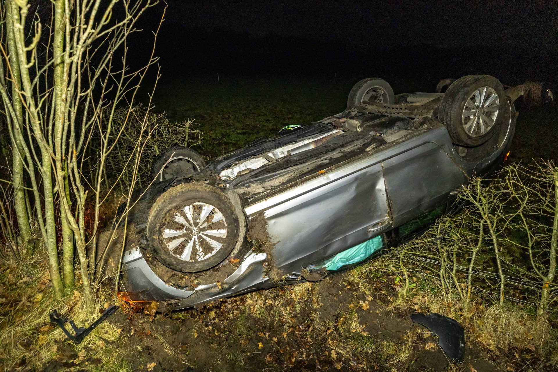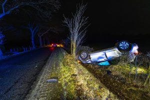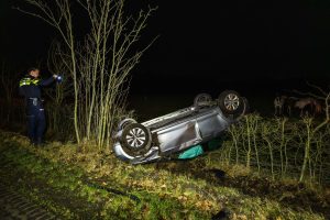 Een automobilist verloor door nog onbekende oorzaak de macht over het stuur en raakte van de weg. Het voertuig belandde daarbij op de kop in een greppel tussen de bomen.