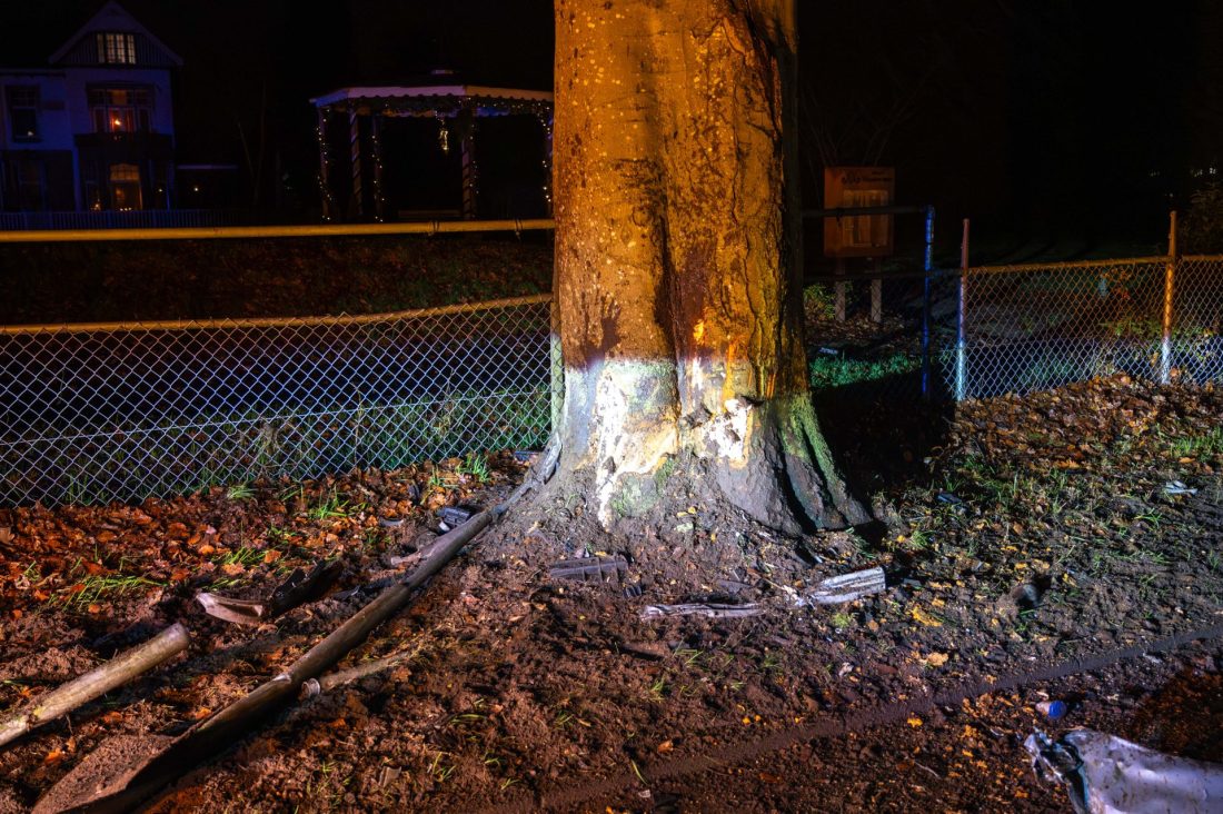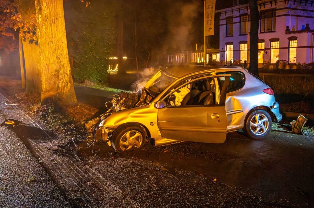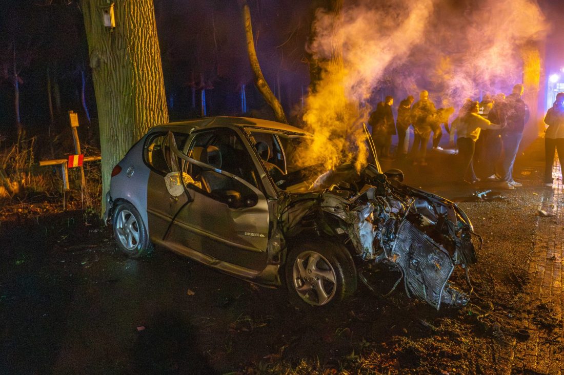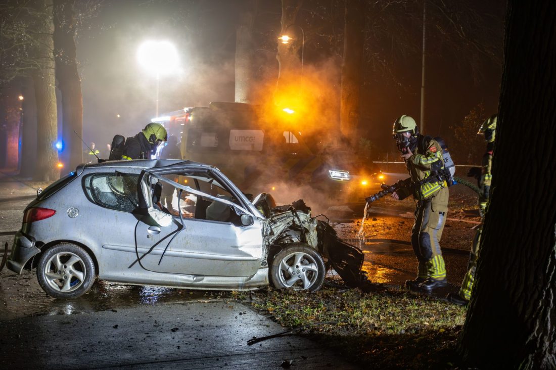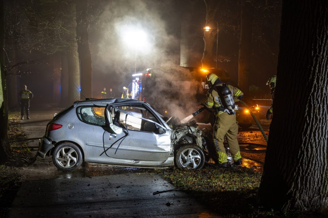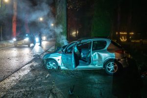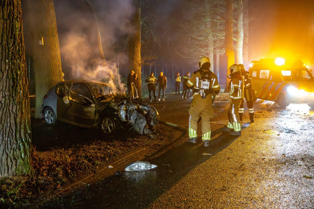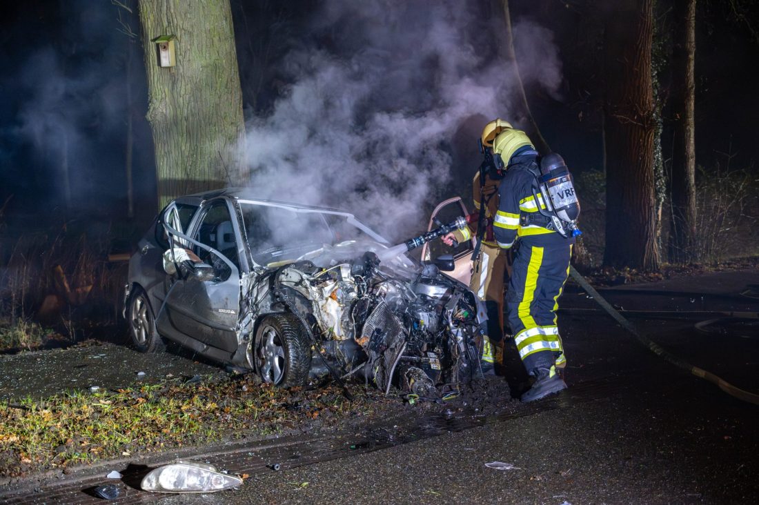 Door nog een onbekende oorzaak verloor de bestuurder macht over het stuur en botste vervolgens tegen een boom. Door de enorme klap vloog de auto in brand en werd voor het ongeval ook de brandweer gealarmeerd. Omstanders hebben de een man die op de bijrijdersstoel zat, uit de auto gehaald en getracht de brand de blussen. De bestuurder was na het ongeval spoorloos en zijn/haar toestand is onbekend. De brandweer is ter plaatse gekomen om de auto af te blussen.