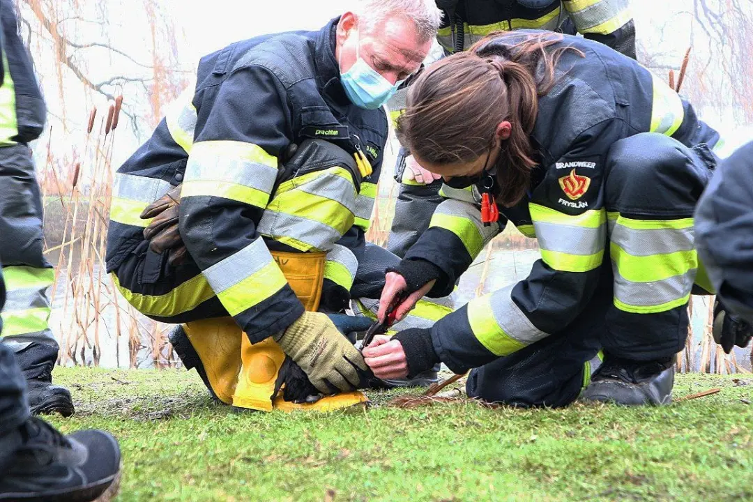Drie personen ontdekten dat er een meerkoet in het water vast zat met een stuk touw. Met behulp van een omstander werd de brandweer gebeld om het dier te helpen. De brandweerlieden hebben de meerkoet uit het water gehaald, waarna ze met een mesje het gaas en touw van zijn pootje en bek hebben verwijderd.