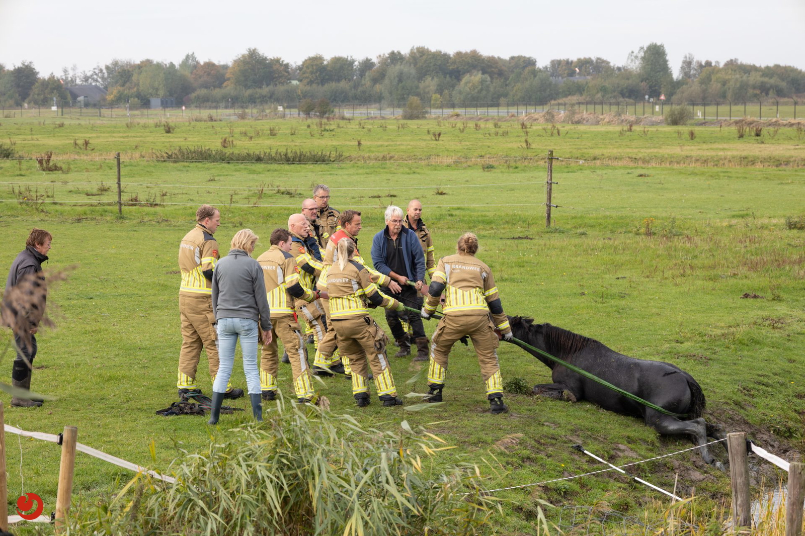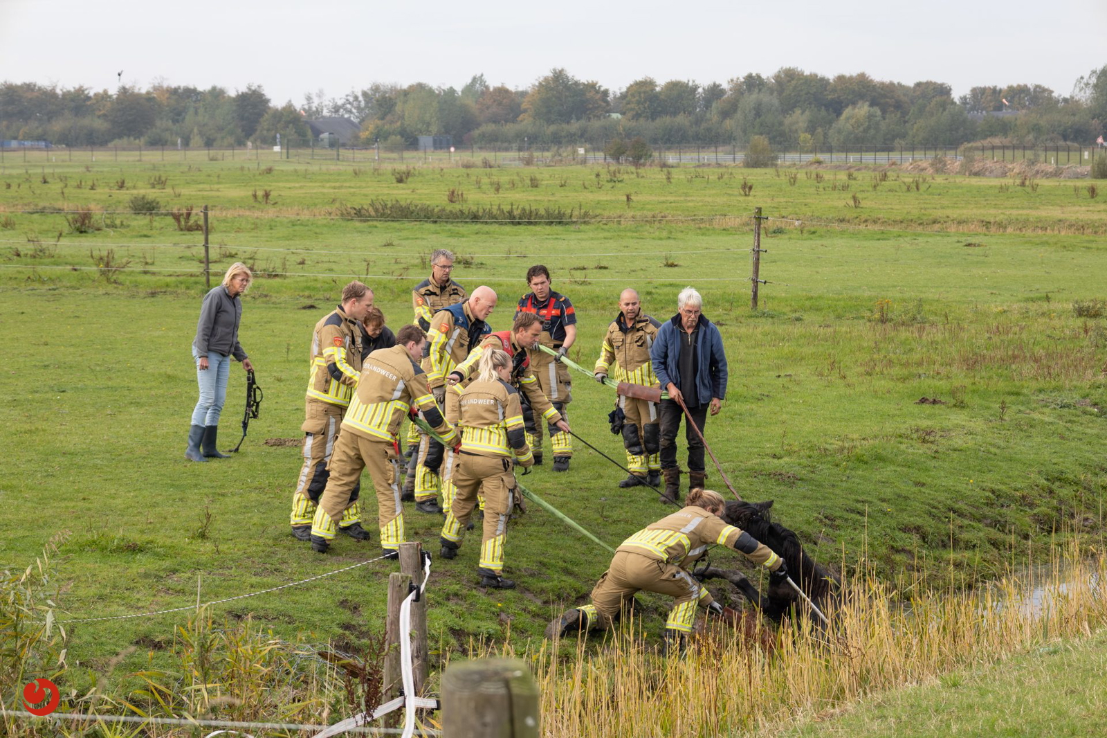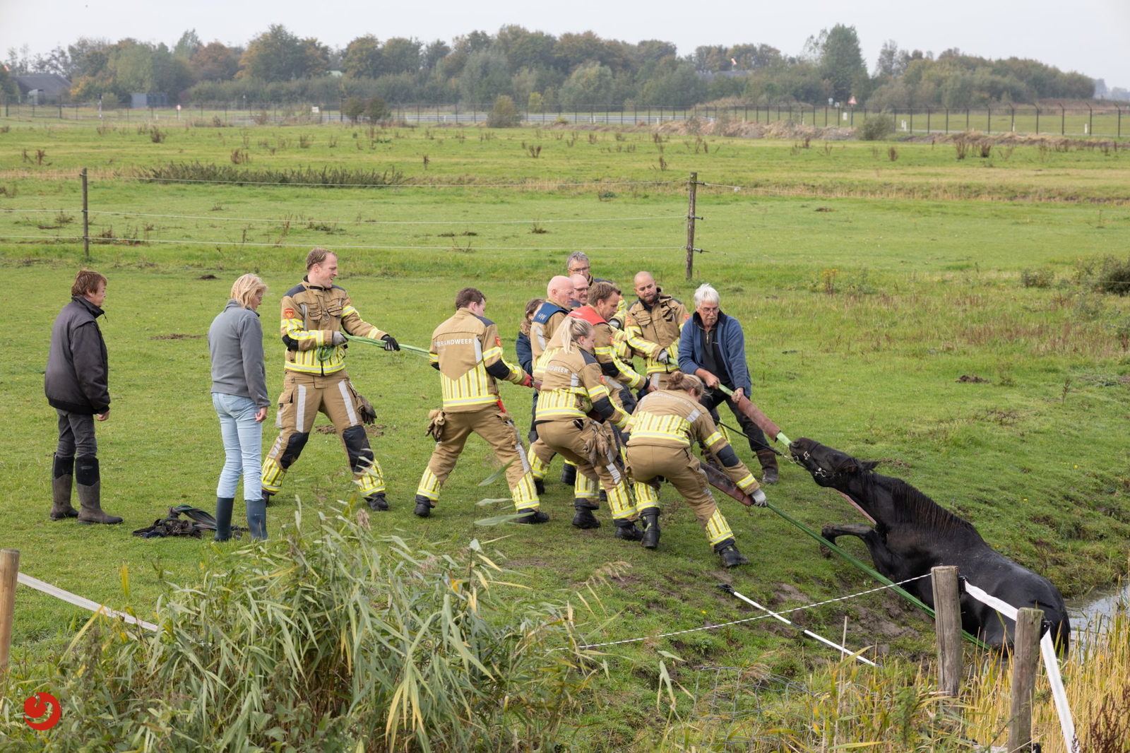 De brandweer ontving de melding omstreeks kwart over tien. Met touwen en vereende krachten kon het paard uit de sloot worden getrokken. Het paard bleef in eerste instantie uitgeput liggen, maar stond daarna op eigen kracht weer op en maakt het goed.