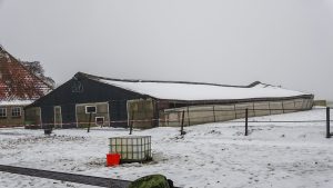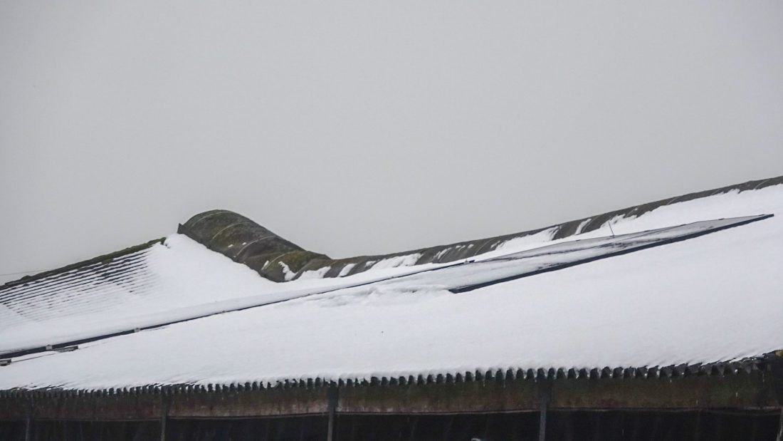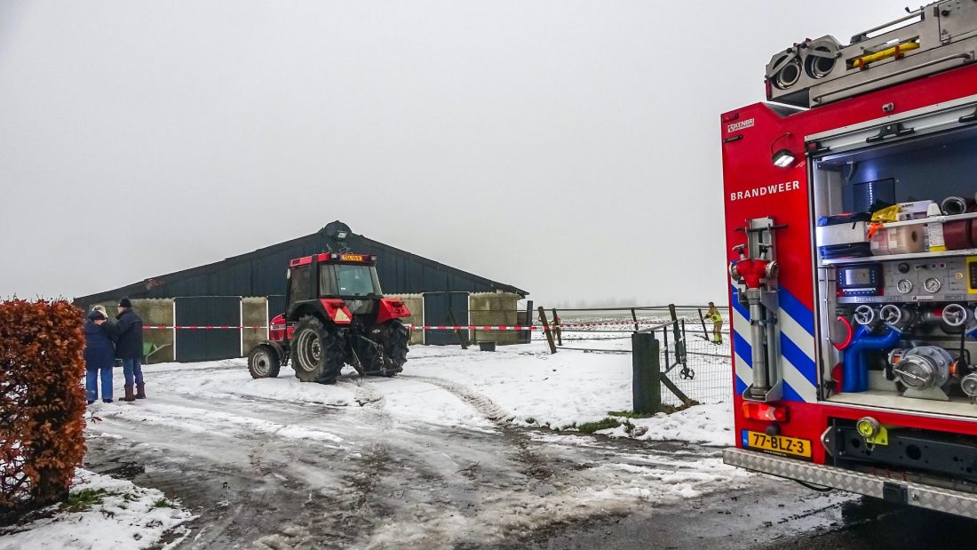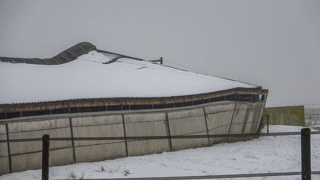 Even voor 13:30 uur is de brandweer van Gytsjerk uitgerukt naar de Nieuwlandsweg. Het dak van een grote schuur is door het gewicht van de sneeuw en het water van de gesmolten sneeuw deels ingezakt en staat op instorten.