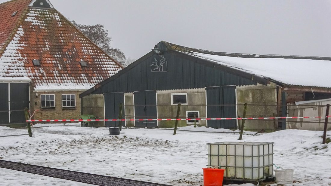 De brandweer heeft de situatie beoordeeld. Het dak steunt op spullen die in de schuur staan. Om ervoor te zorgen dat niemand meer in de buurt van de schuur komt is een lint gespannen.