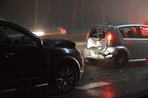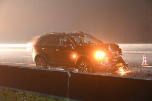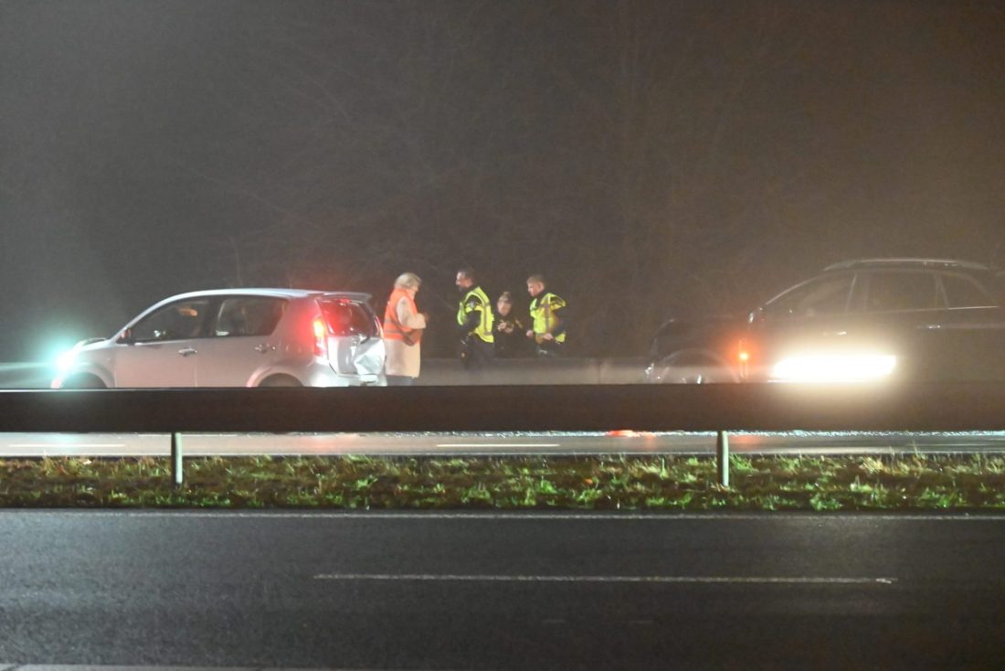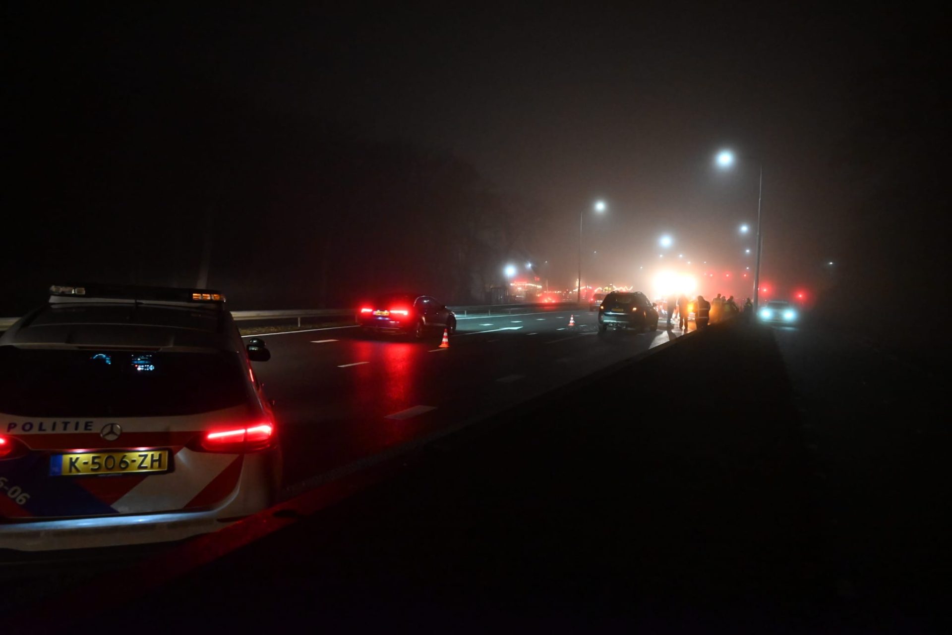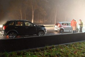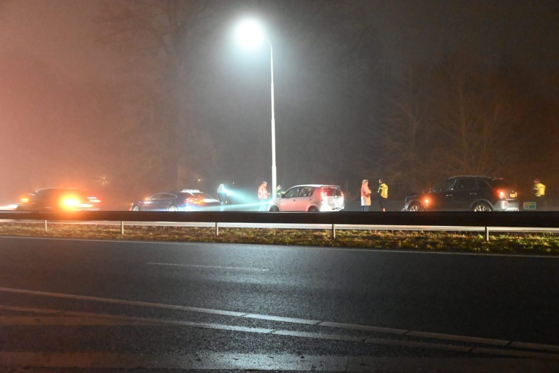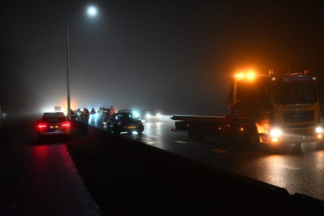 In de dichte mis zag een automobilist(e) dat het verkeer stilstond of langzaam reed voor de verkeerslichten en klapte achterop zijn voorganger.