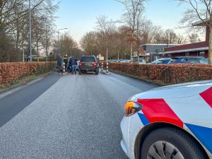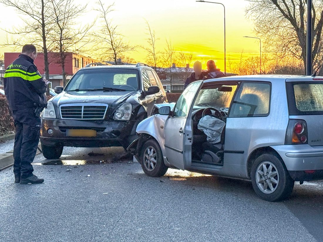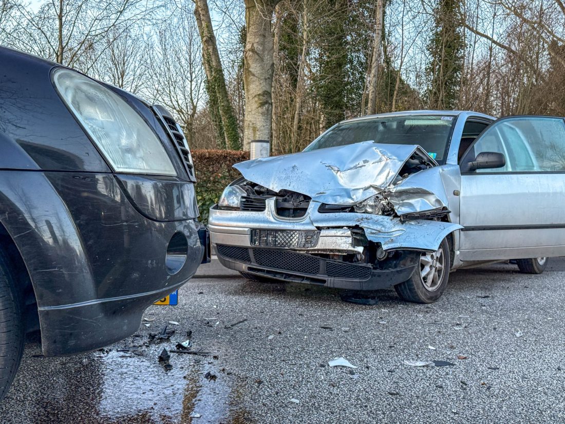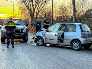 Door een laag staande zon kwamen twee auto’s frontaal met elkaar in botsing in een wegversmalling. Ambulancepersoneel heeft ter plaatse de inzittenden gecontroleerd maar vervoer naar het ziekenhuis bleek niet nodig.