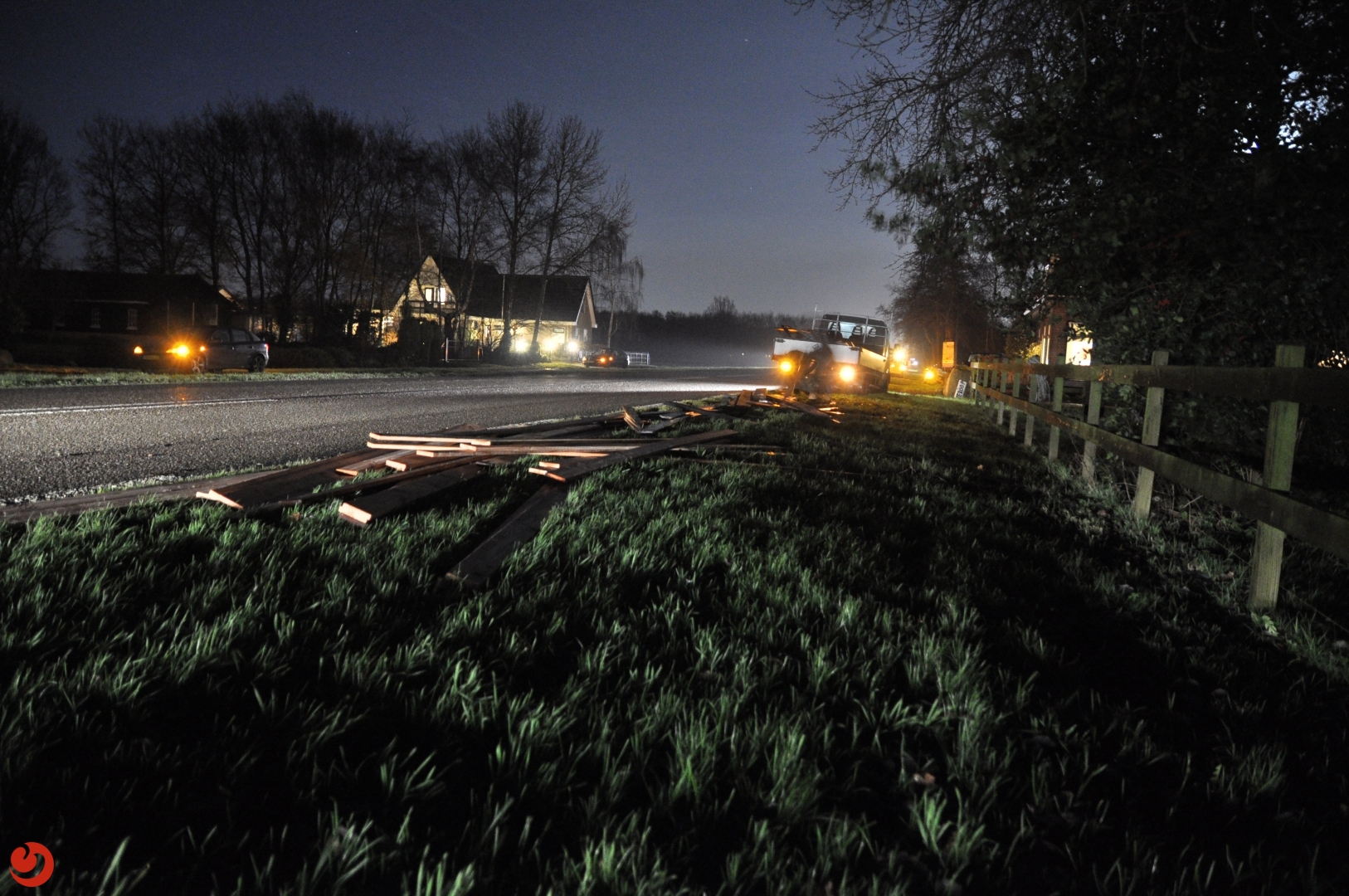 Even voor zes uur in de avond kwamen vier auto’s met elkaar in botsing. Een geschaarde aanhanger, welke was geladen met stenen en houten planken, kwam met een andere auto frontaal in botsing, waarna deze een bestelbus ramde en in een droge sloot tot stilstand kwam. Een ander busje die hier achteraan reed kon de lading houten planken niet ontwijken en reed er overheen.
