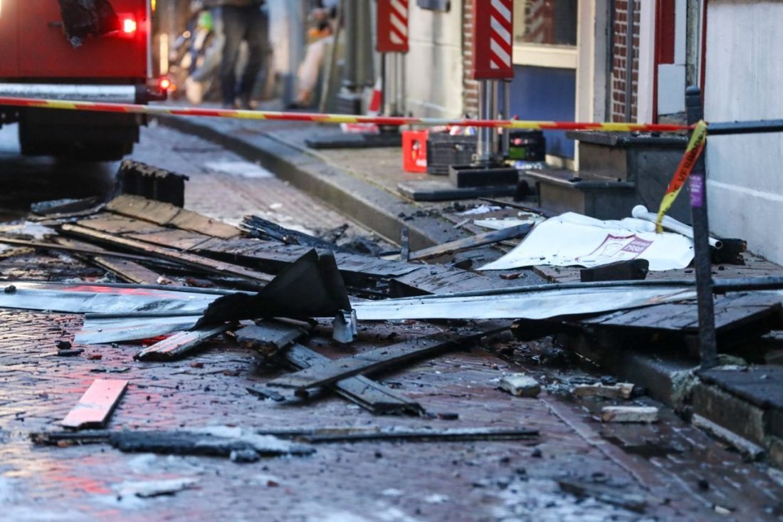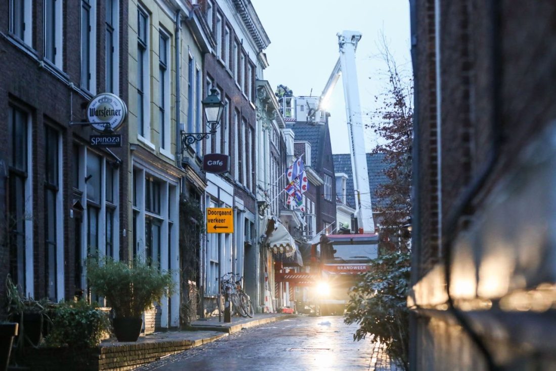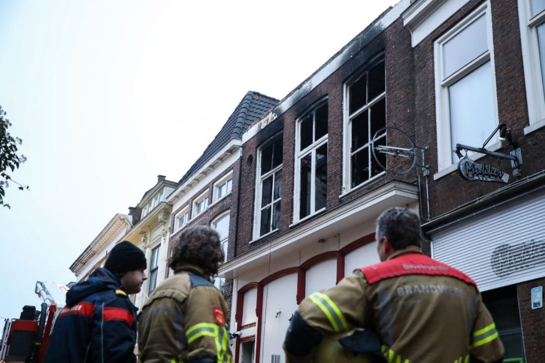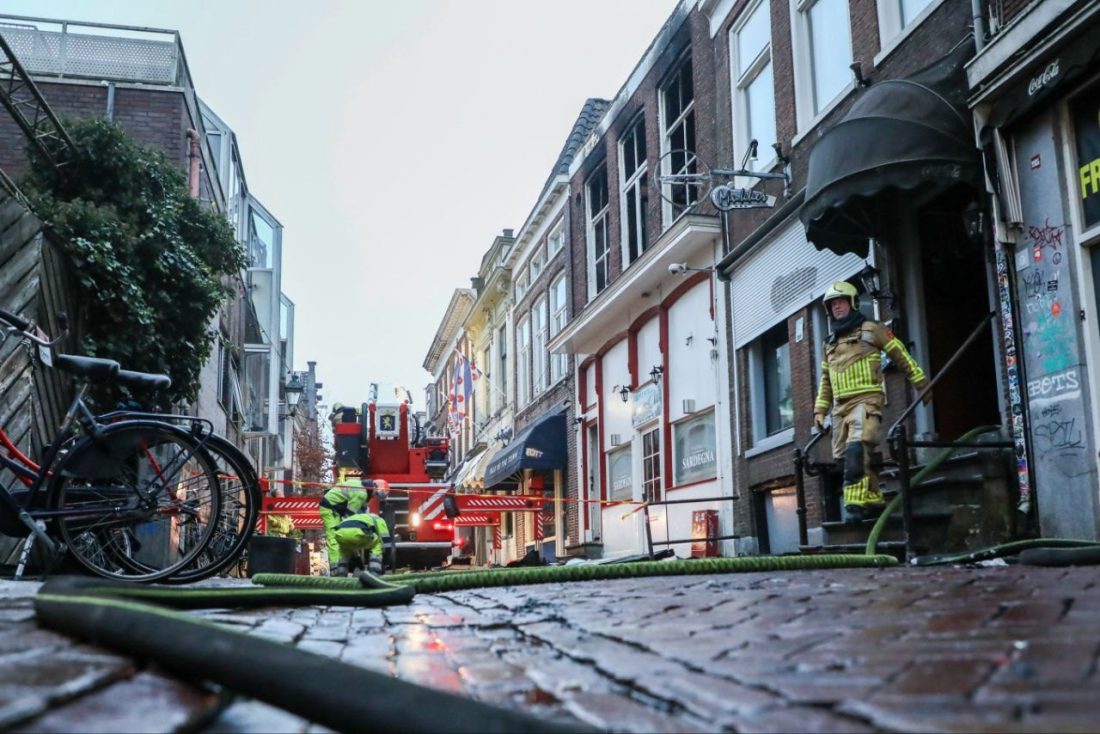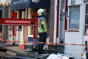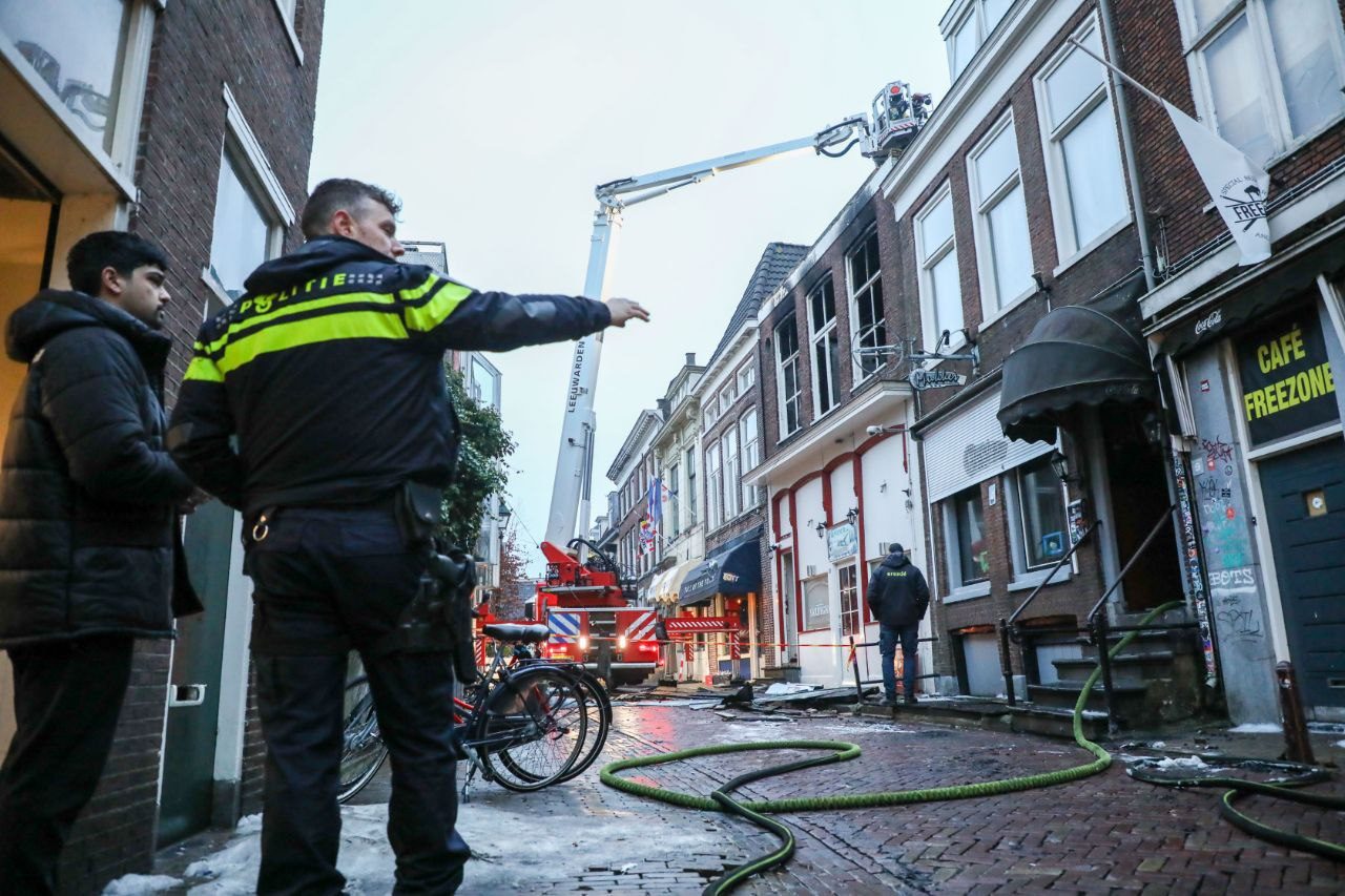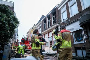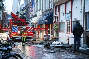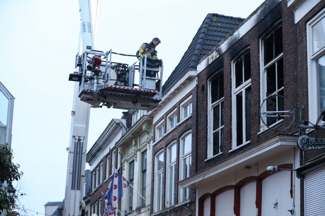 LEEUWARDEN – Terwijl brandweerlieden dinsdagochtend nog druk bezig zijn met het nablussen van de verwoestende brand in een pizzeria aan de Grote Hoogstraat, wordt bij daglicht langzaam de omvang van de schade duidelijk. De gevels van het pand zijn instabiel en staan op instorten.