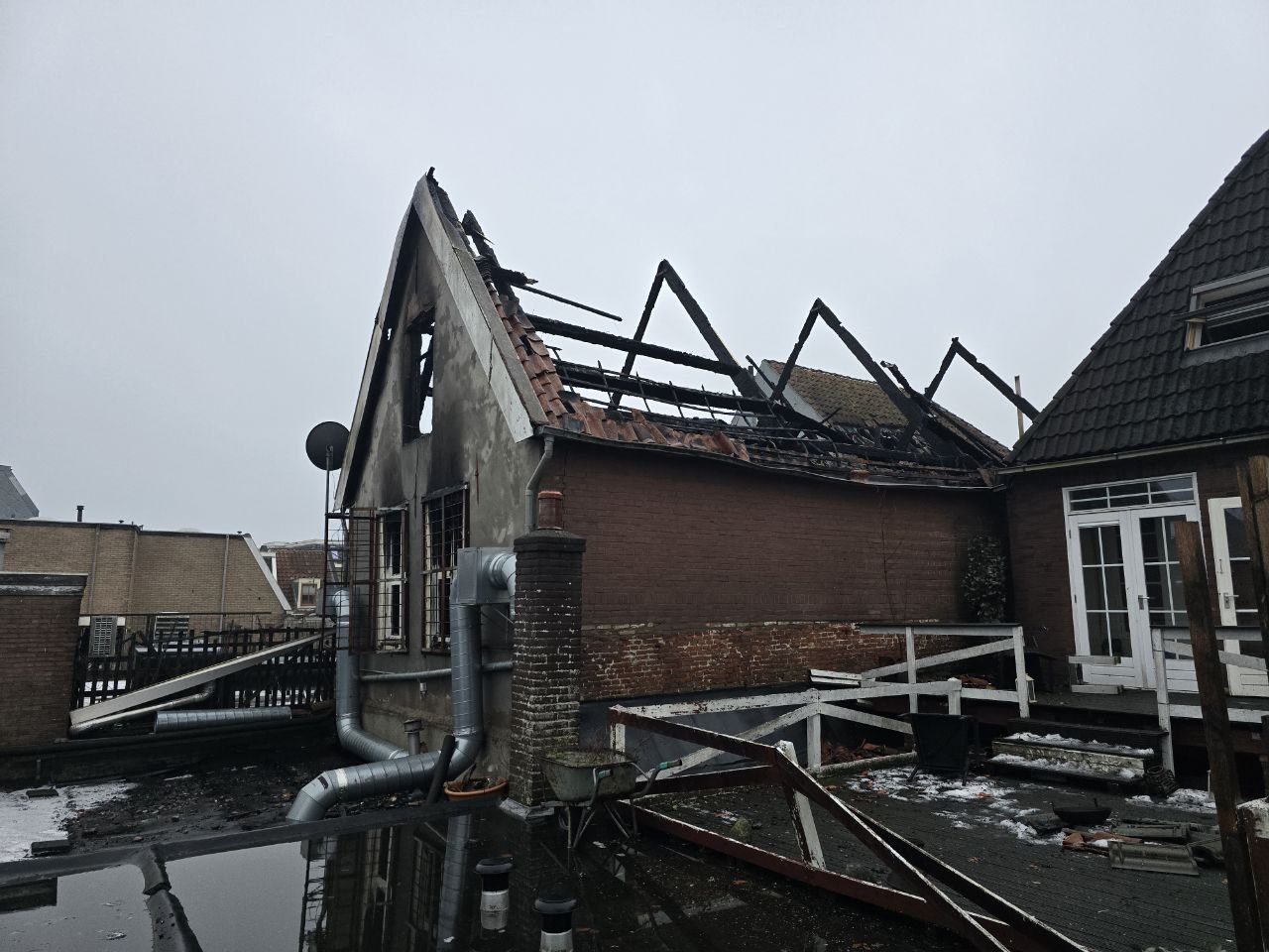 – De pizzeria is volledig verloren gegaan bij de brand, omliggende panden hebben lichtere brandschade, maar vooral rook- en waterschade.