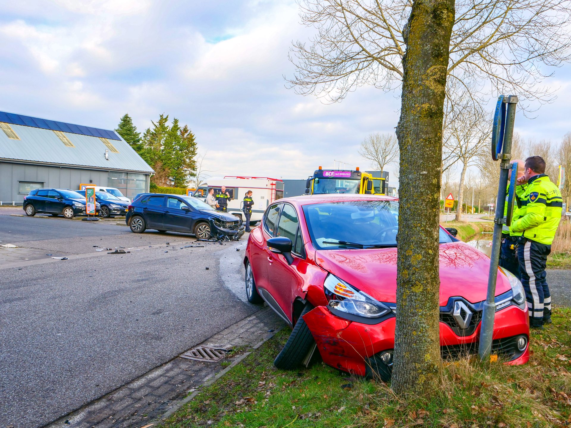 Het ongeval gebeurde omstreeks half negen. Politie en ambulance zijn met spoed ter plaatse gekomen om hulp te verlenen. Door nog onbekende oorzaak botsten twee voertuigen met elkaar. Eén auto kwam tot stilstand tegen een paaltje en een boom, terwijl de andere wagen aan de overzijde van de weg eindigde. De inzittenden zijn door ambulancepersoneel nagekeken en een persoon is overgebracht naar het ziekenhuis.
