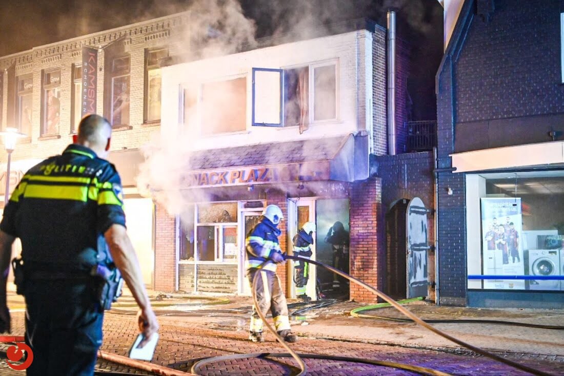We zijn in #Wolvega bij de snackplaza aan het blussen. Er is op de begane grond brand met veel zwarte rook. Er zijn geen personen in het pand aanwezig.