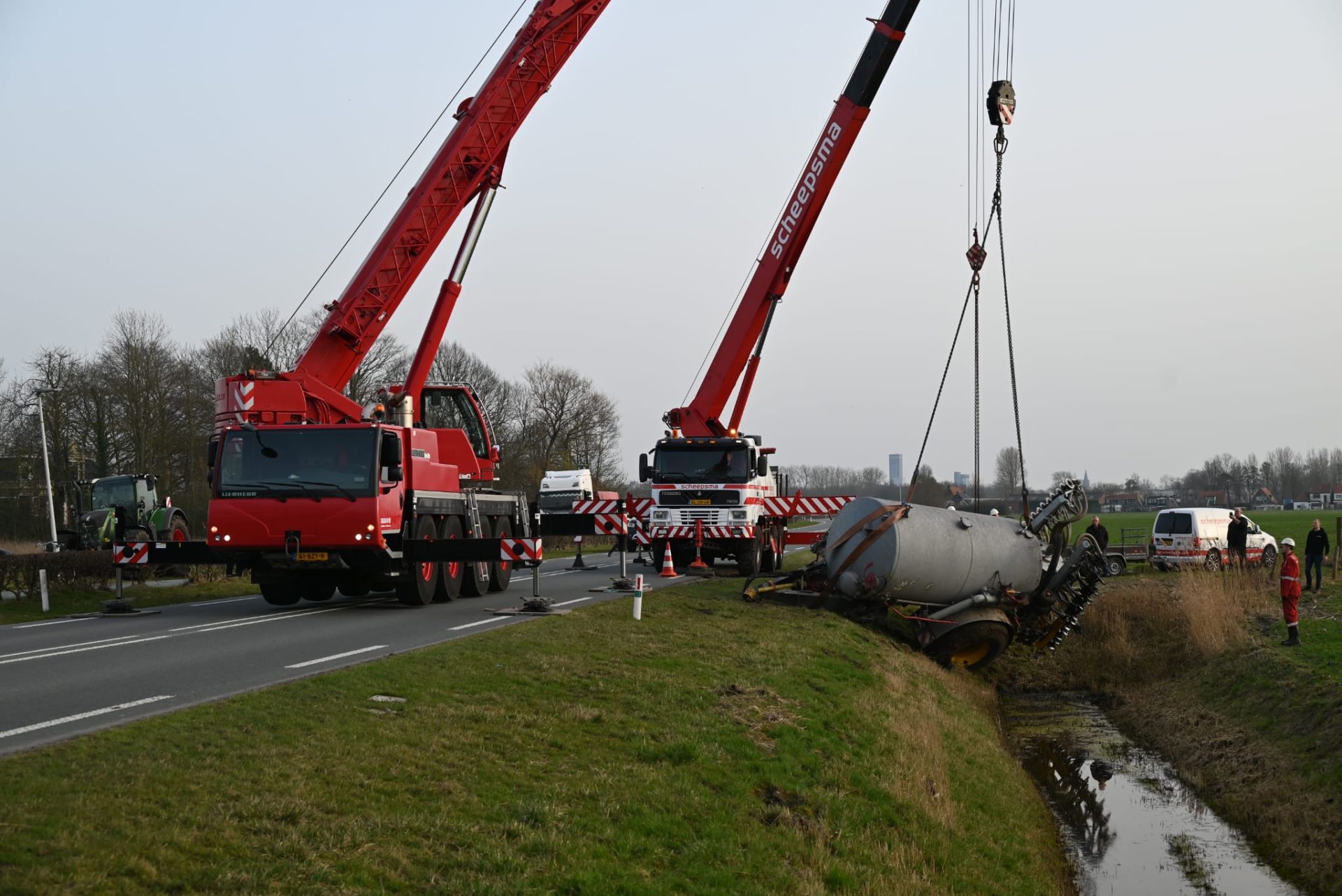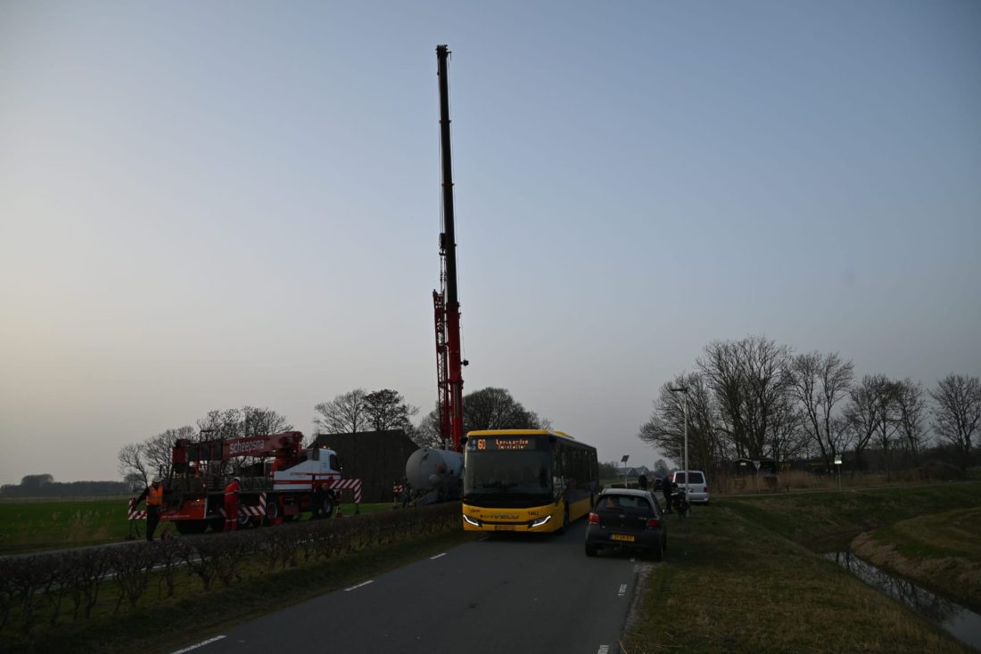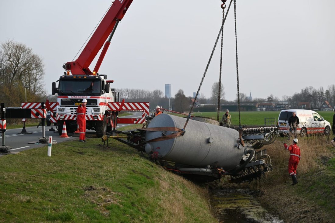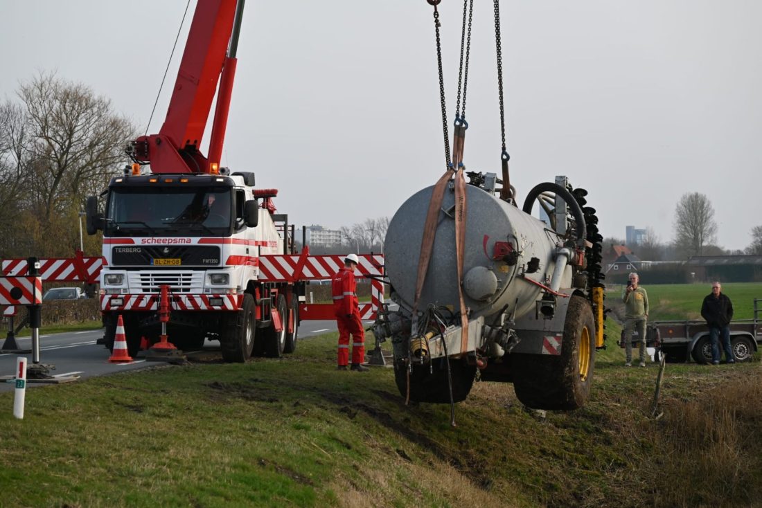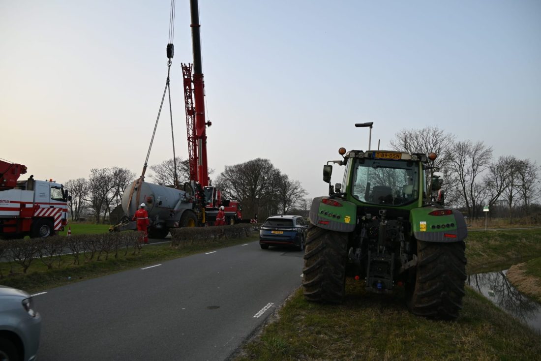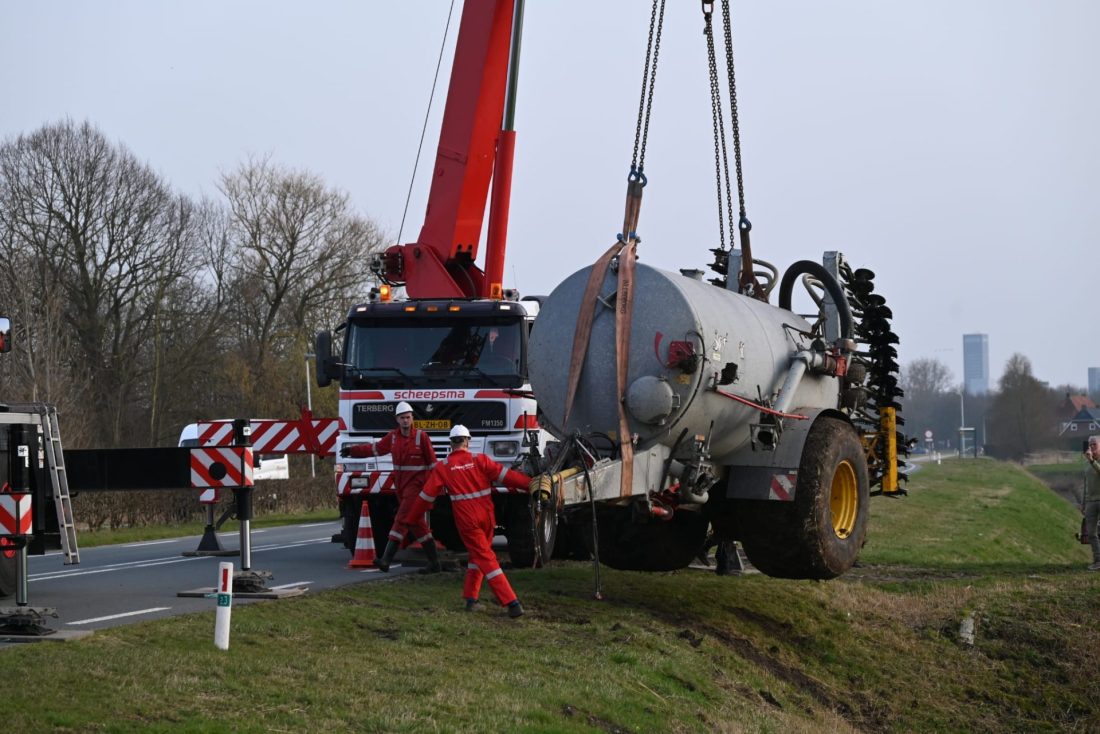 JELSUM – Vrijdagmiddag werd tijdens de avondspits de Bredyk (N357) geruime tijd afgesloten, omdat er grote hijskranen op de weg stonden voor de berging van een giertank die in de sloot lag.