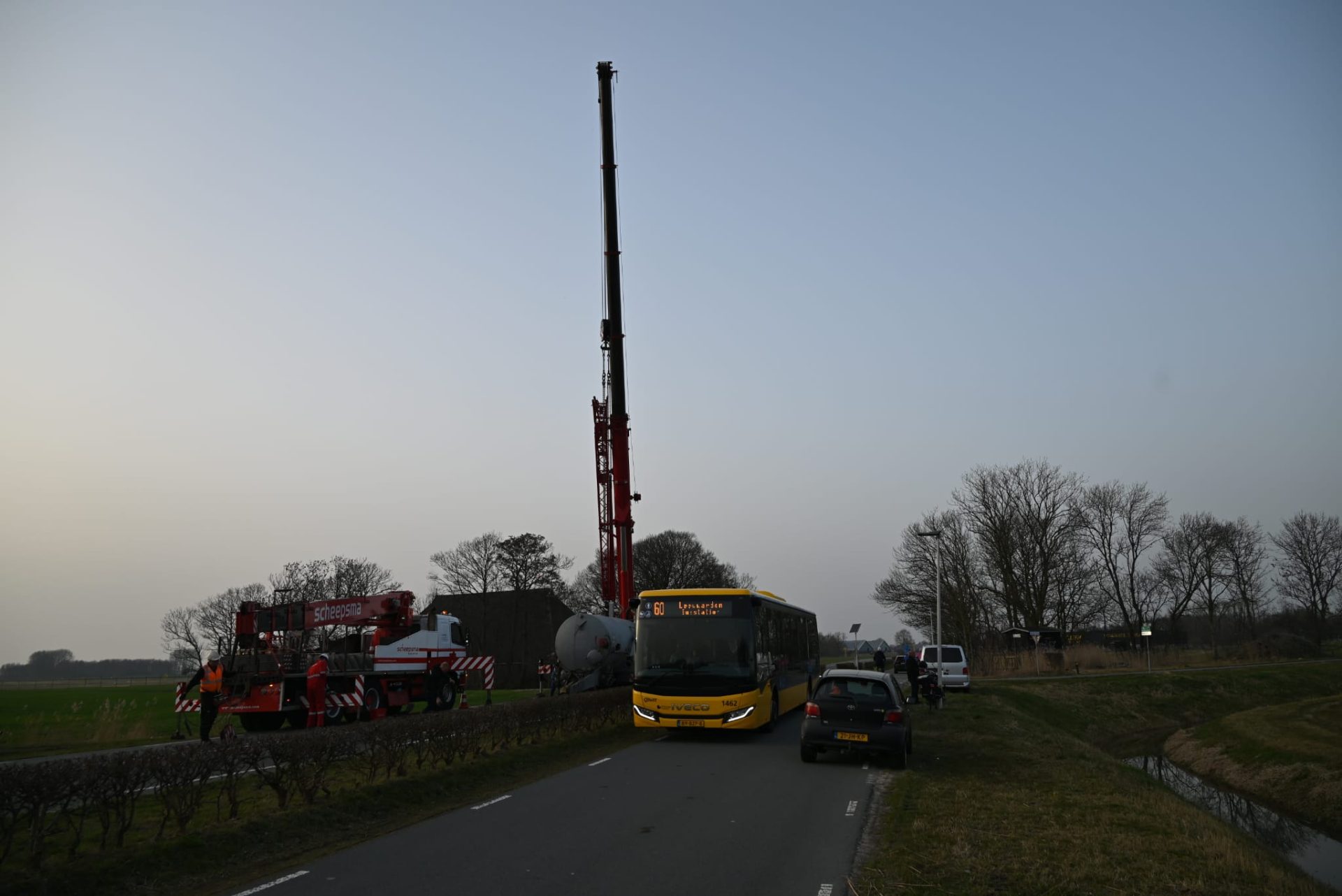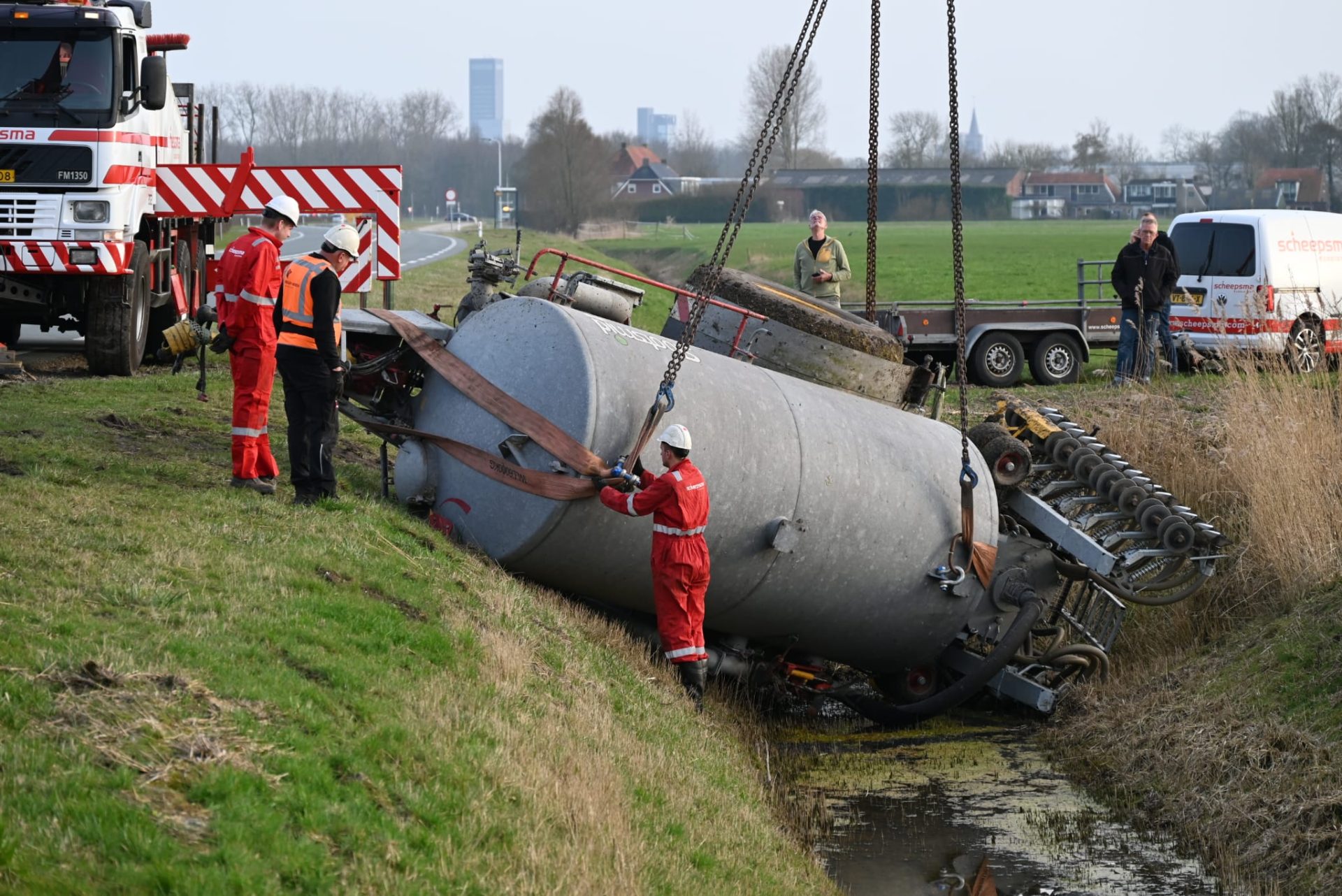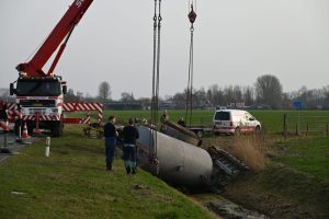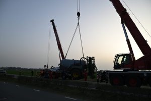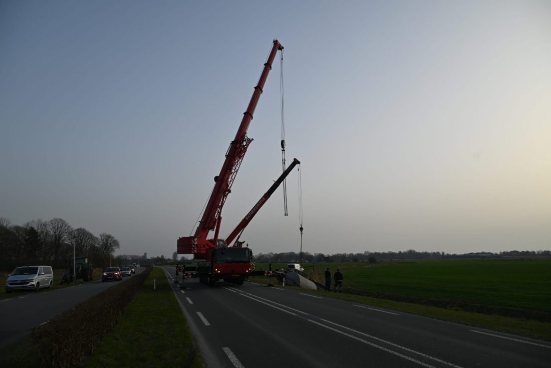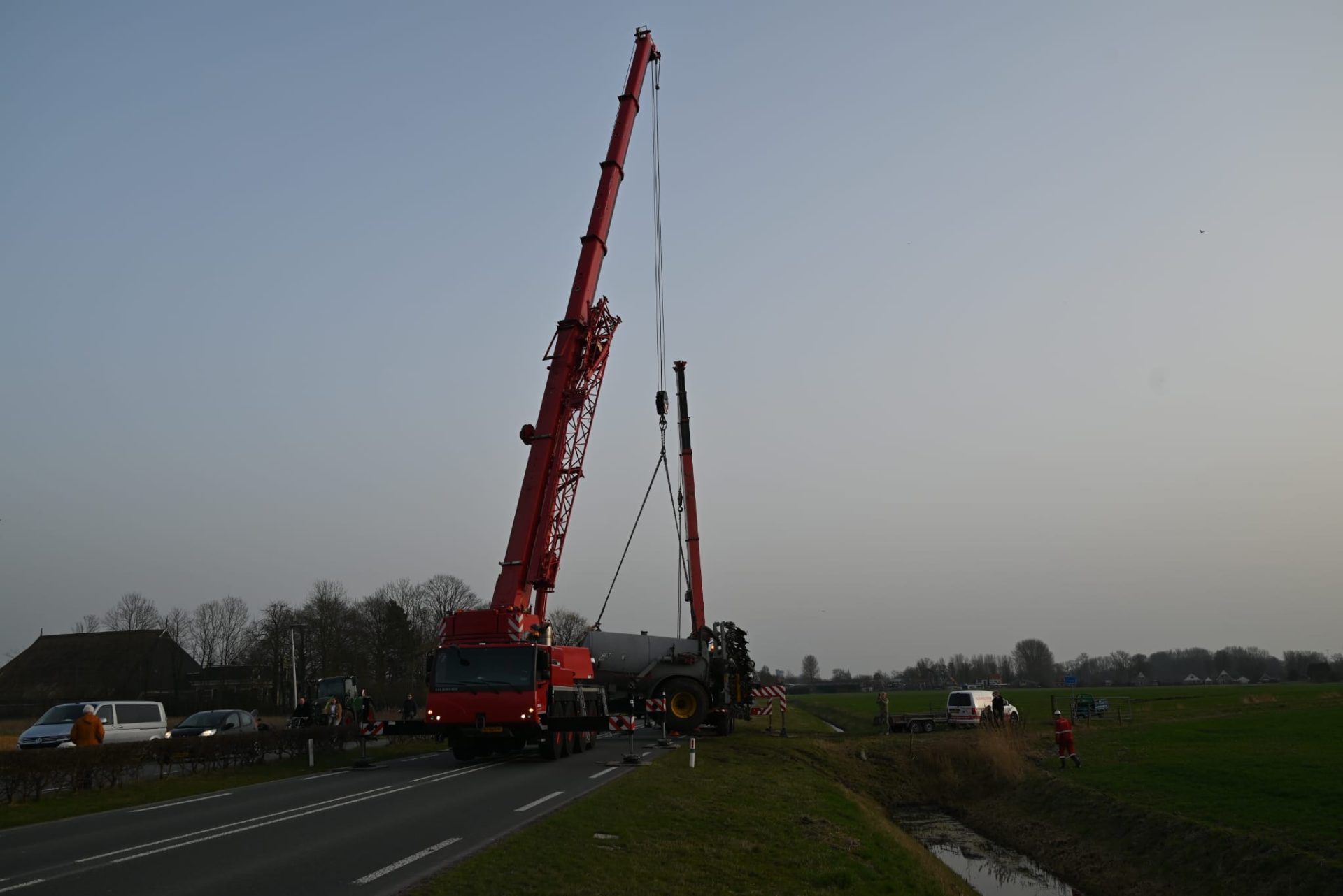 JELSUM – Vrijdagmiddag werd tijdens de avondspits de Bredyk (N357) geruime tijd afgesloten, omdat er grote hijskranen op de weg stonden voor de berging van een giertank die in de sloot lag.