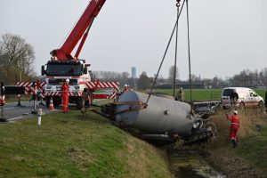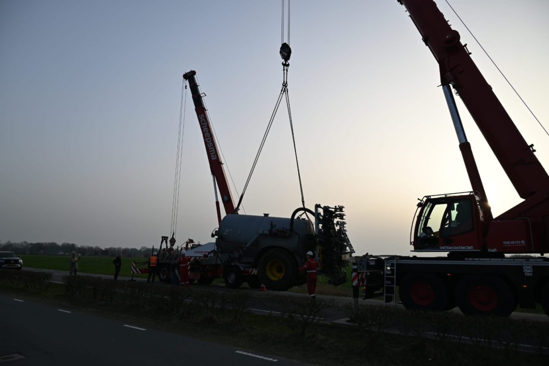 Rond kwart voor zes was de giertank uit de sloot en op zijn wielen gezet, met een tractor werd deze vervolgens afgevoerd.