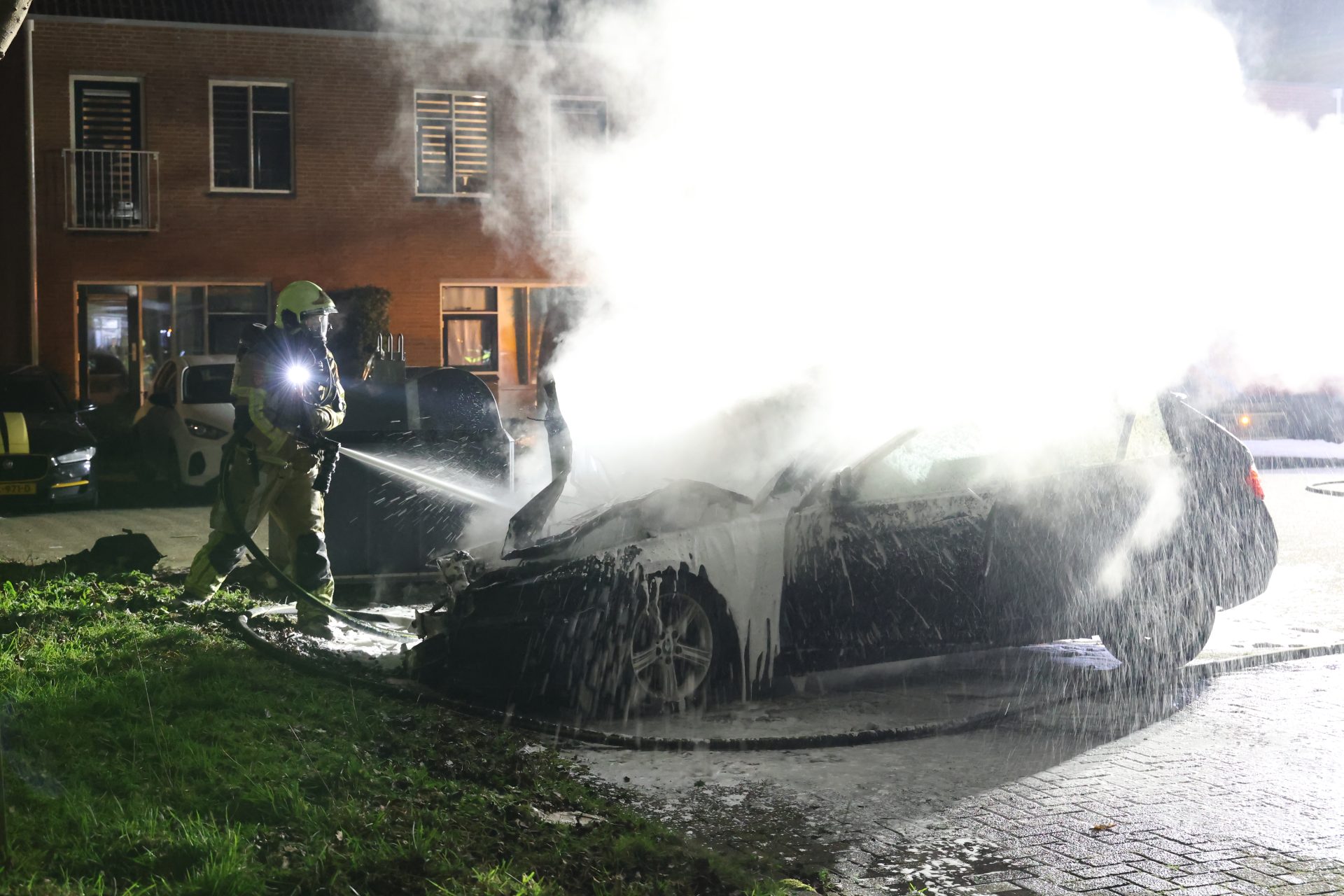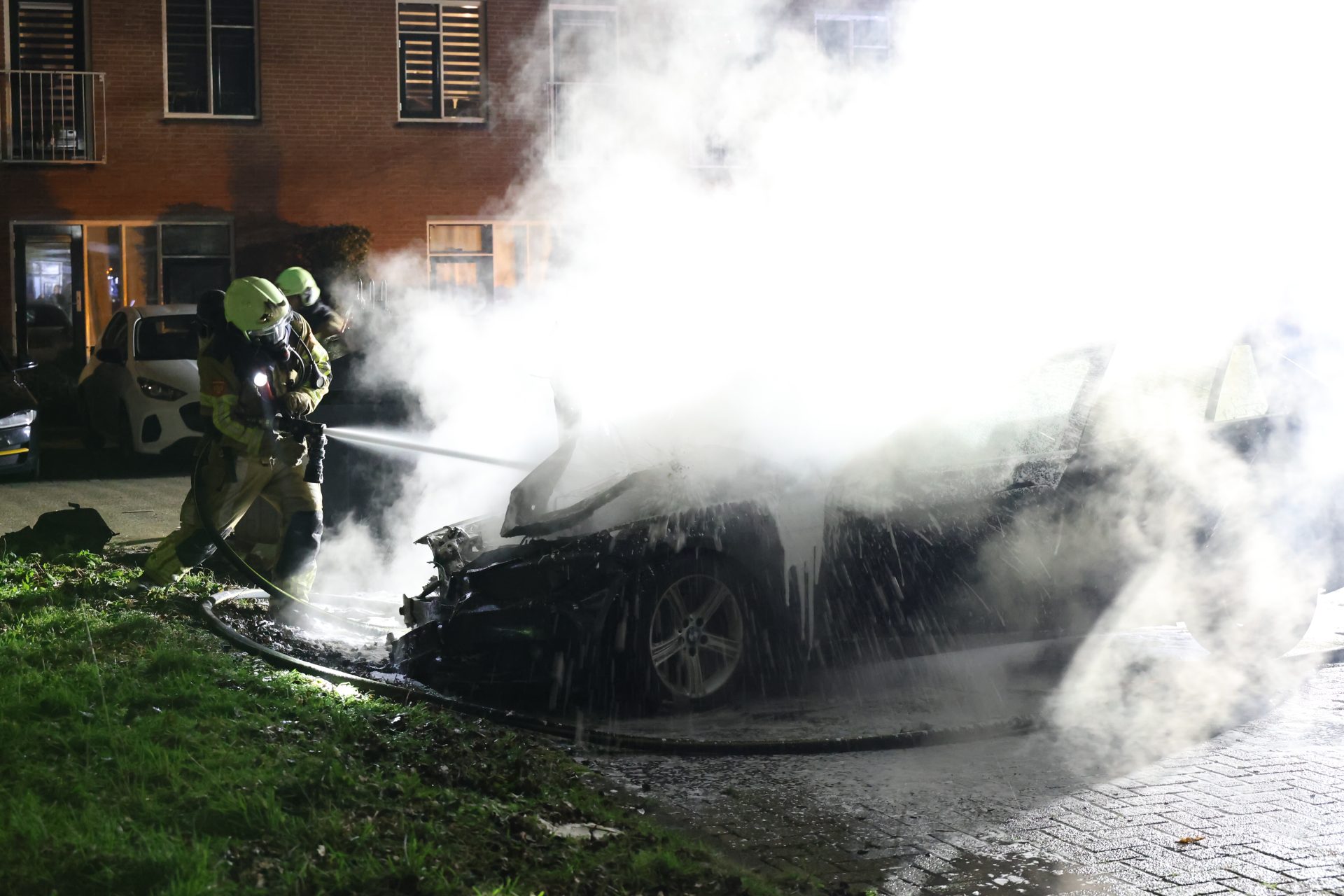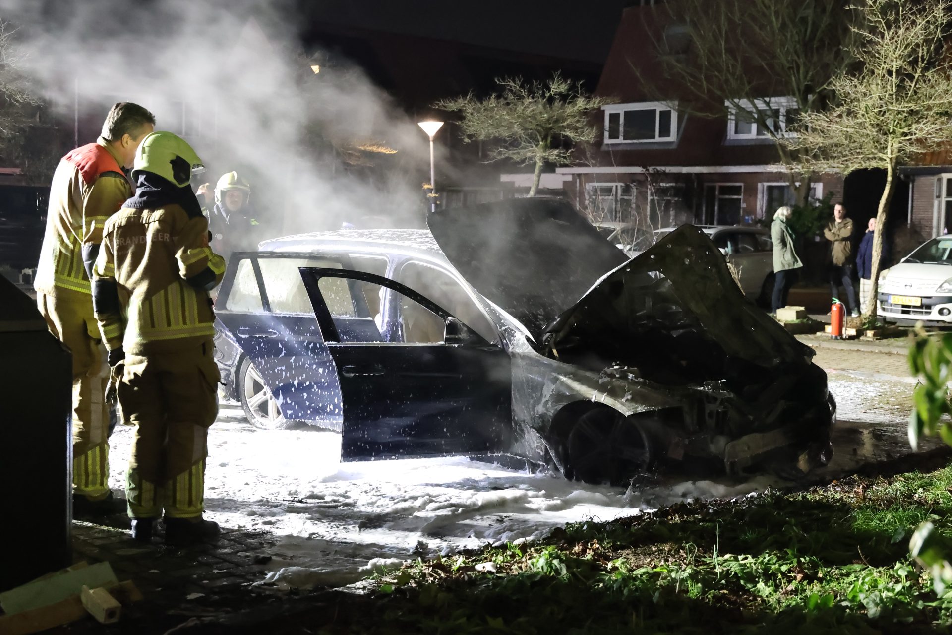 Rond 4:20 uur was het opnieuw raak in de Gerard Terborchstraat. Daar stond een auto al in lichterlaaie bij aankomst en van de brandweer.