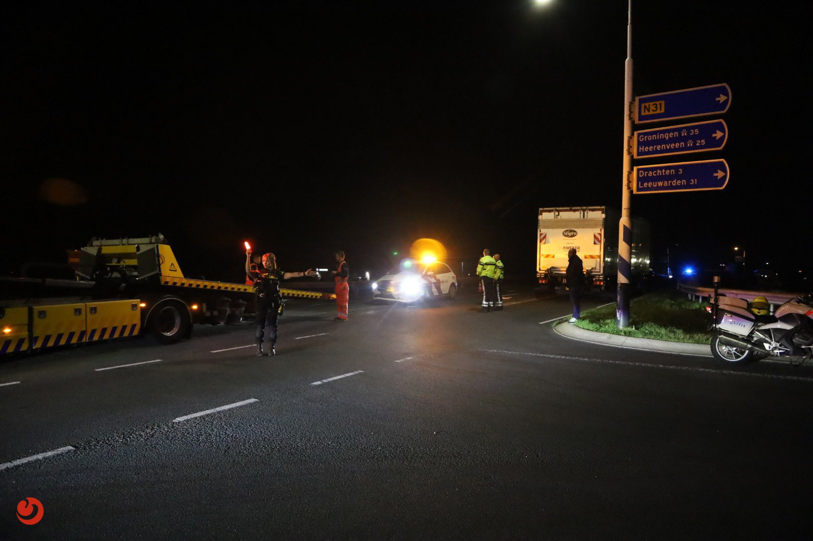 Twee auto’s kwamen eerst met elkaar in botsing na een voorrangsfout. De politie sloot daarop de weg volledig af om het ongeval veilig af te handelen. Tijdens de afzetting probeerde een vrachtwagenchauffeur van Sligro langs het incident te rijden, waarna hij tegen de zijkant van de dienstdoende politieauto botste.