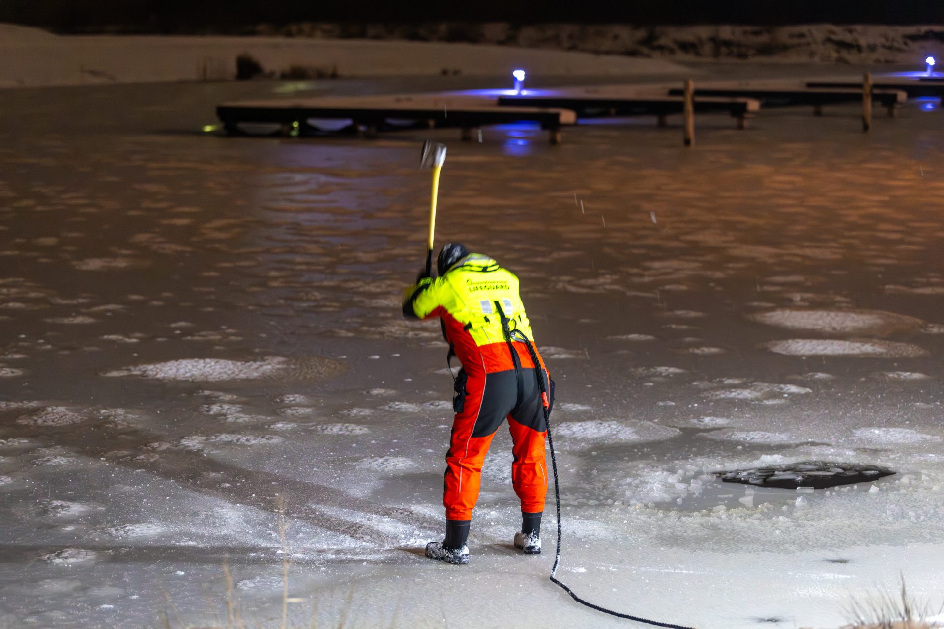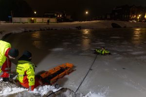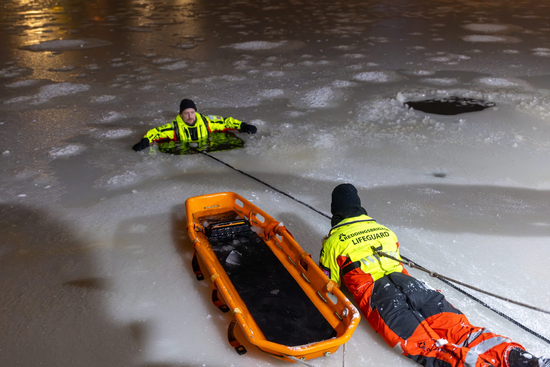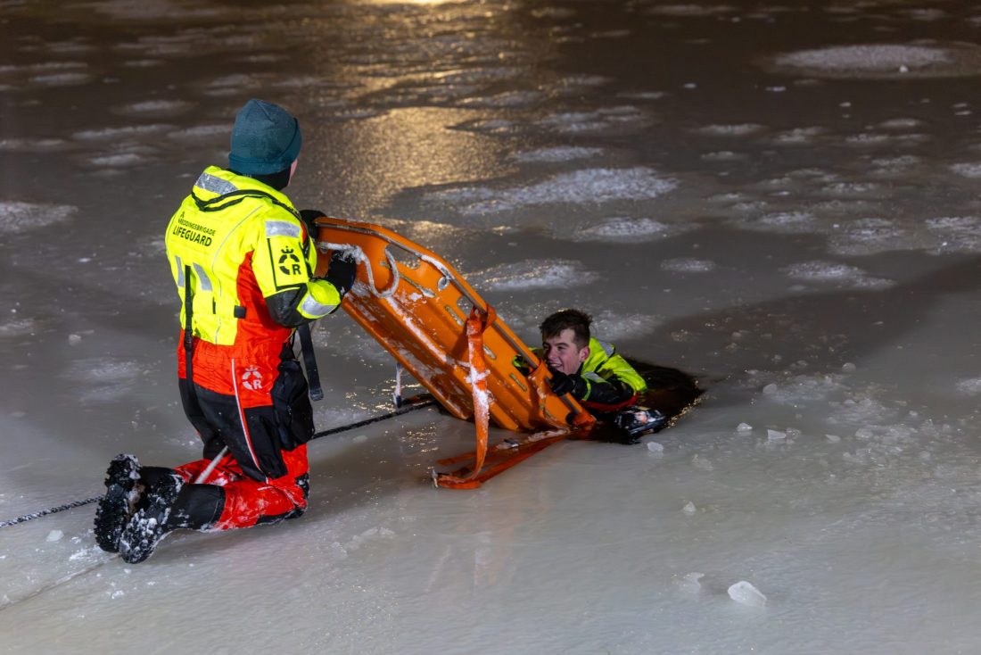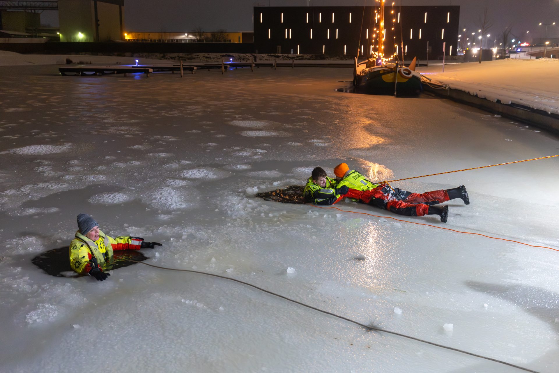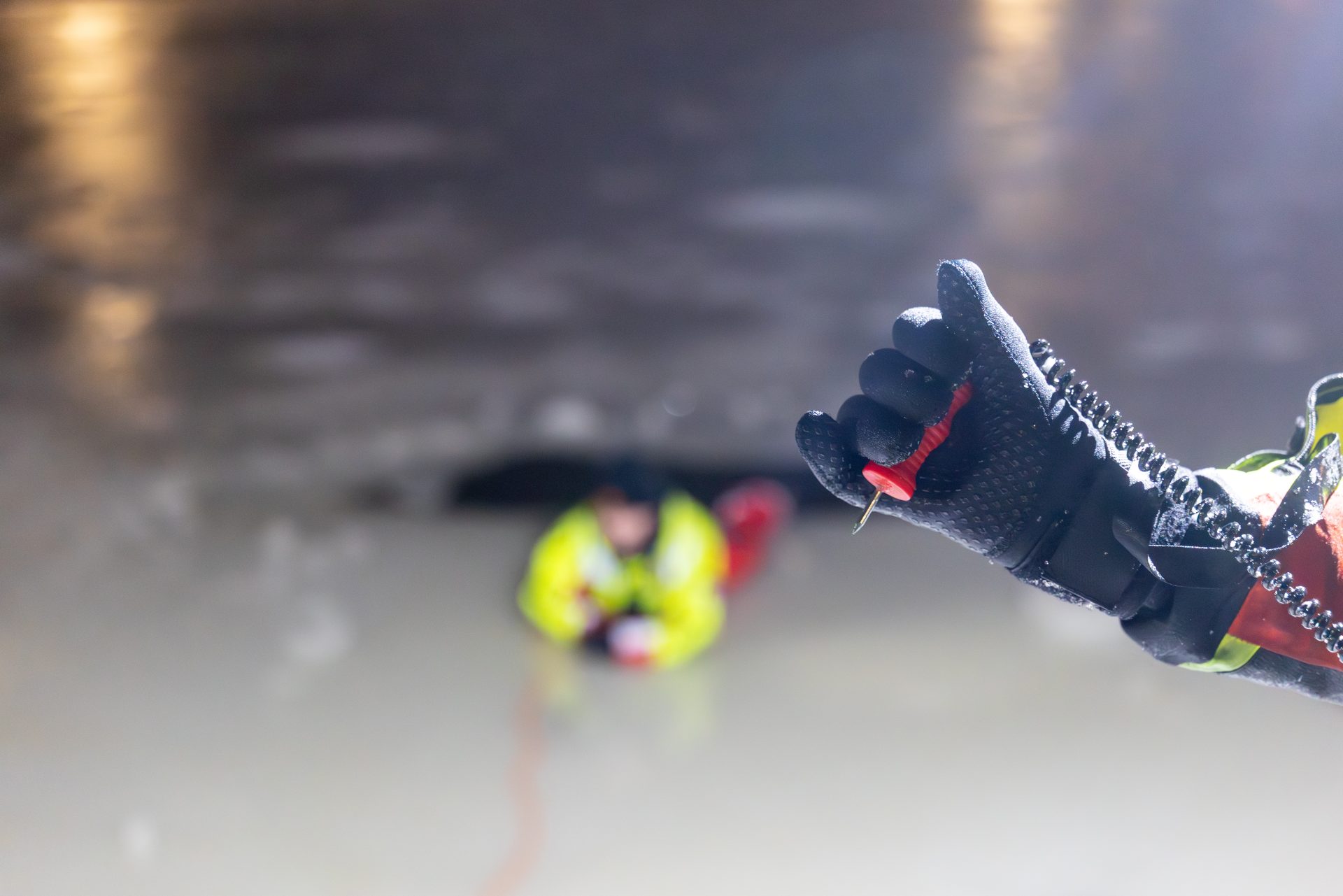 De focus van de avond lag in de eerste plaats op zelfredzaamheid. “Het belangrijkste is dat je niet in paniek raakt,” legt een woordvoerder van de brigade uit. “We leren onze leden hoe ze met behulp van ijsprikkers zelfstandig uit een wak kunnen klimmen door horizontaal uit het water te ‘zwemmen’ op het dikke ijs.”
