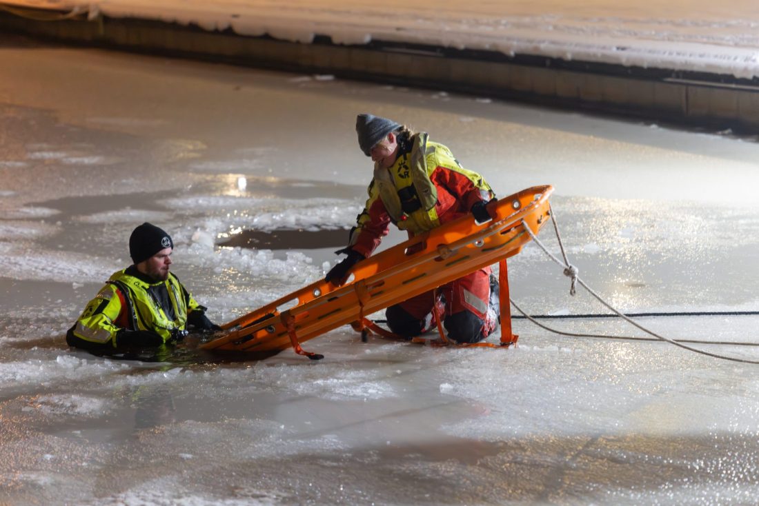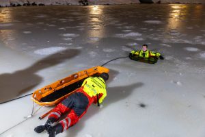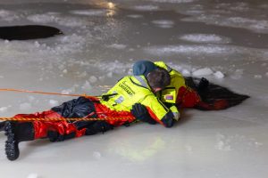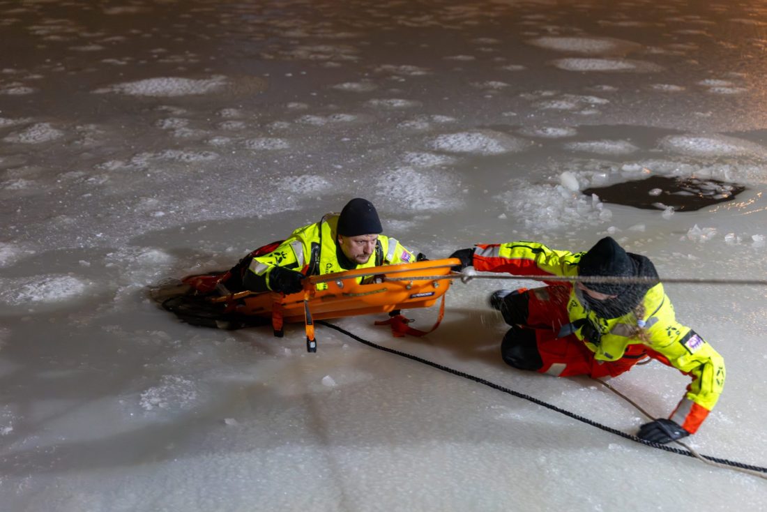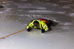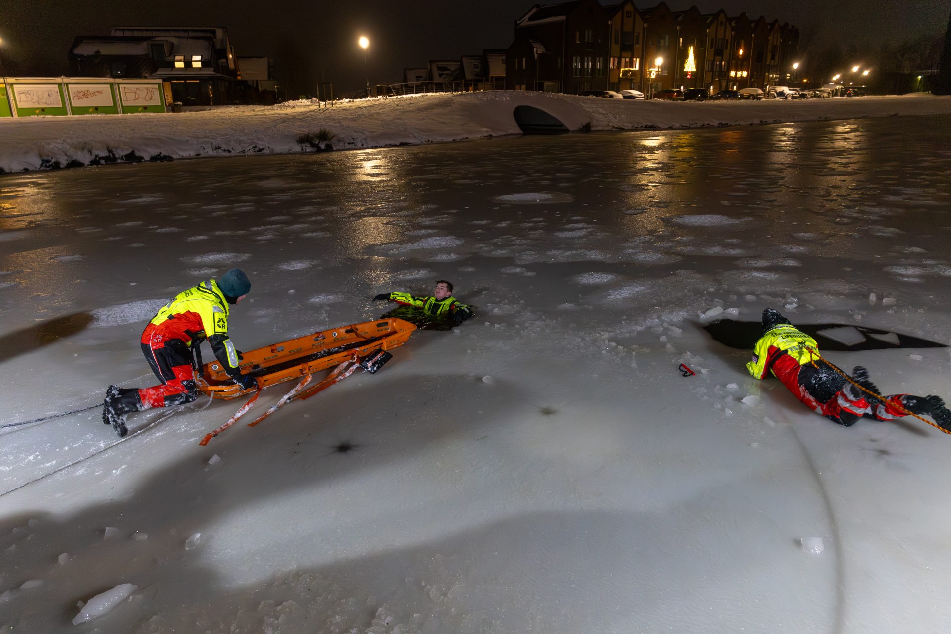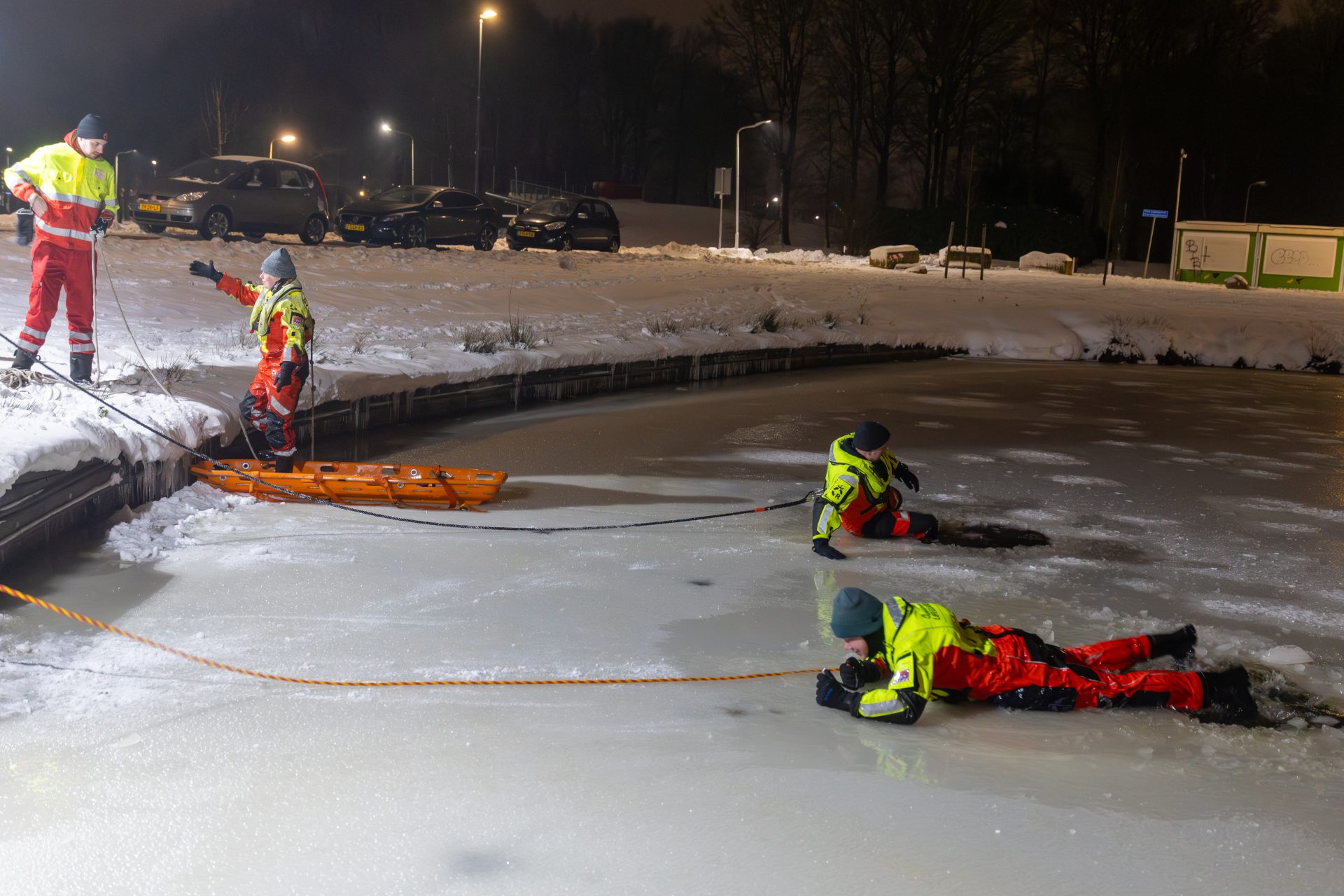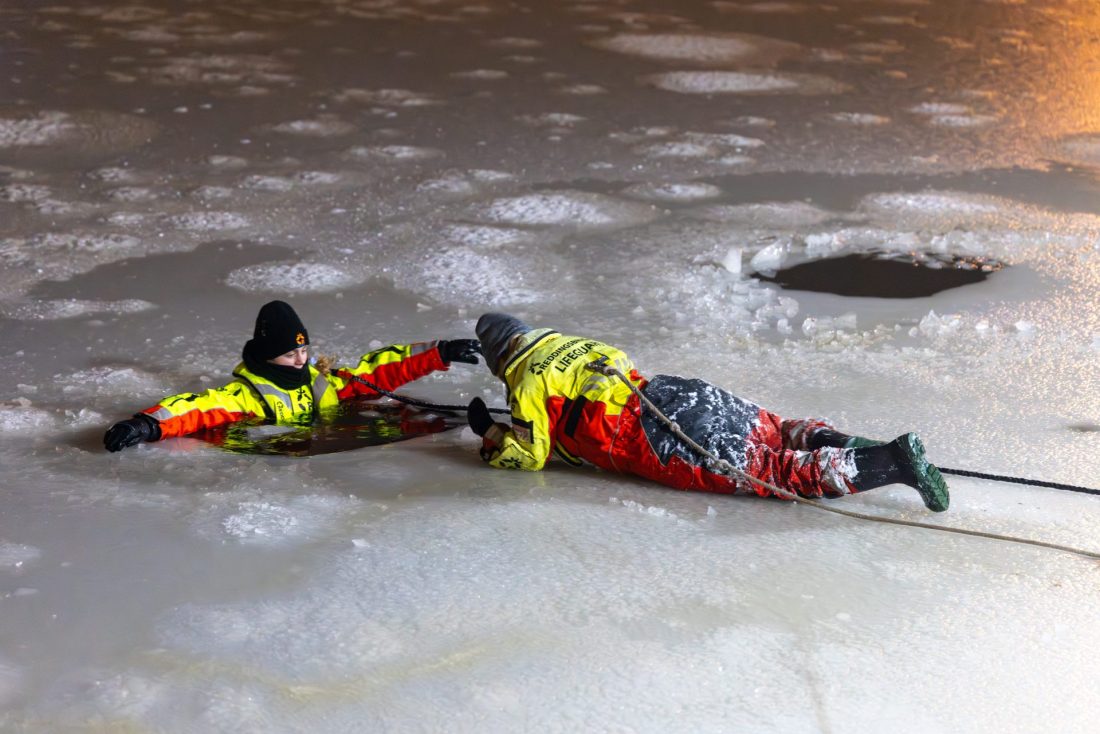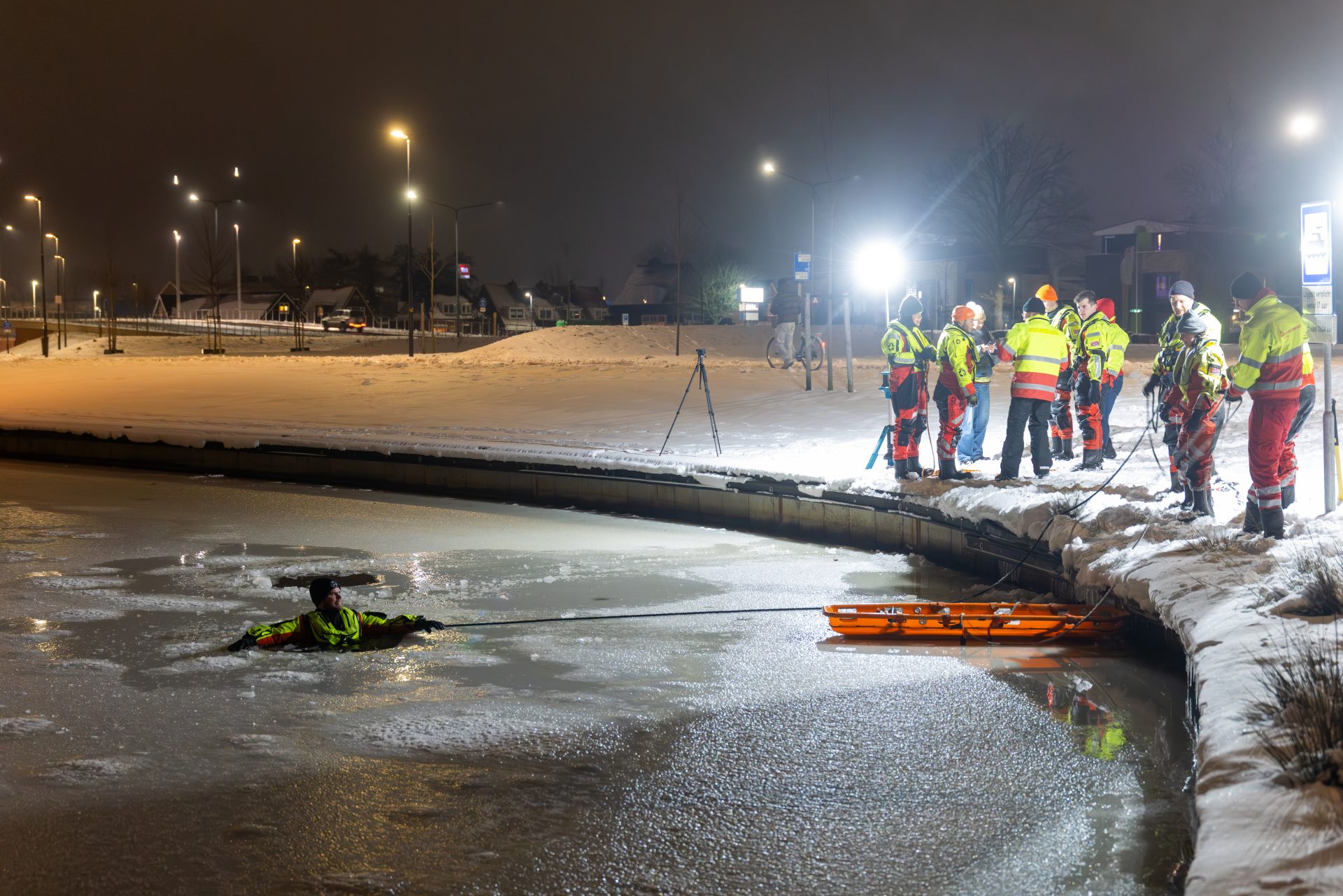 De focus van de avond lag in de eerste plaats op zelfredzaamheid. “Het belangrijkste is dat je niet in paniek raakt,” legt een woordvoerder van de brigade uit. “We leren onze leden hoe ze met behulp van ijsprikkers zelfstandig uit een wak kunnen klimmen door horizontaal uit het water te ‘zwemmen’ op het dikke ijs.”