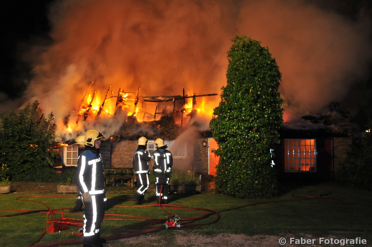 Bij aankomst van de brandweer sloegen de vlammen al metershoog uit het dak van de rietgedekte woonboerderij.