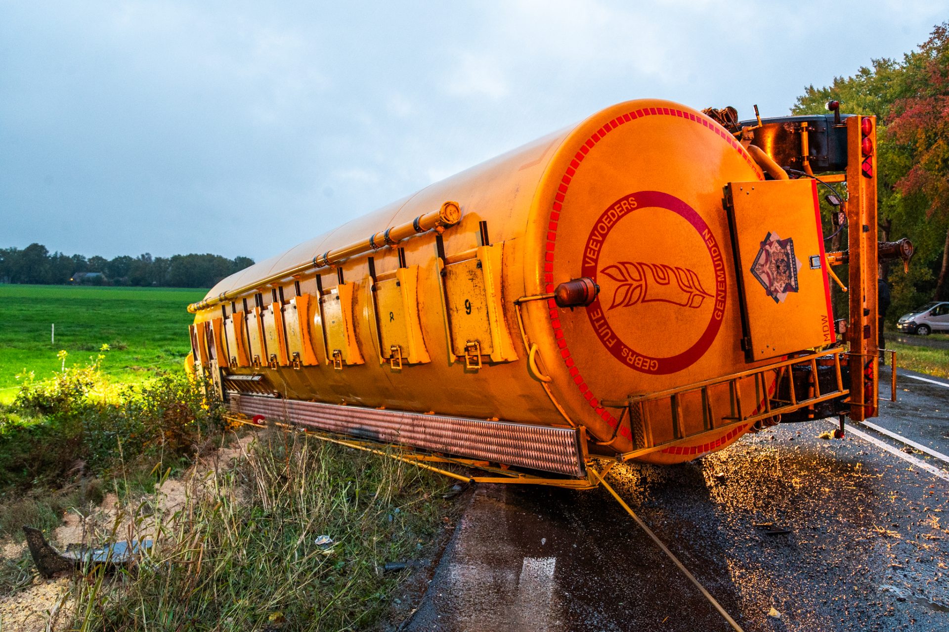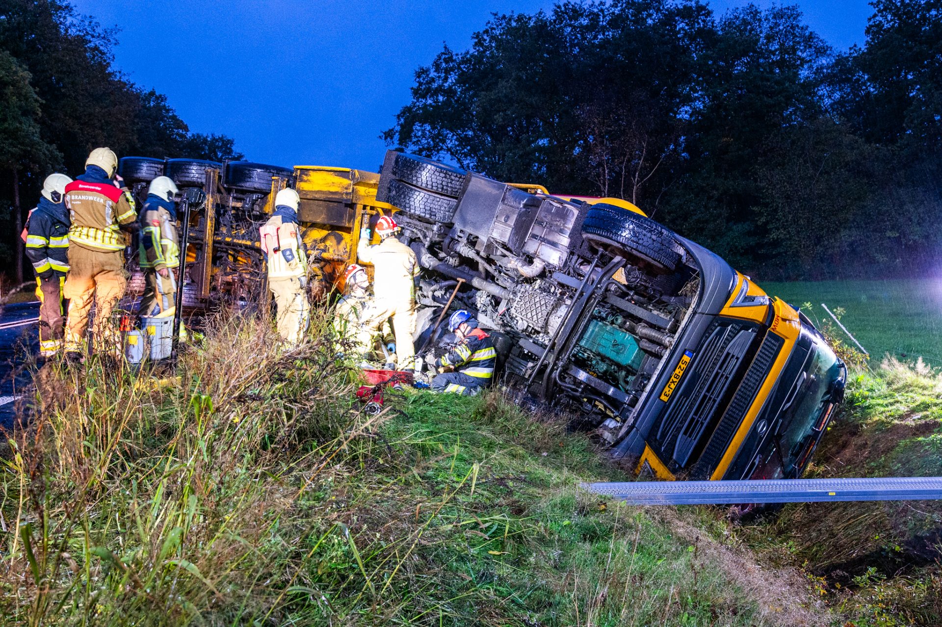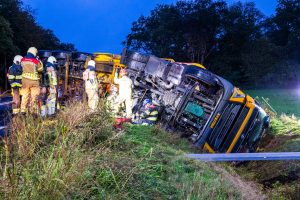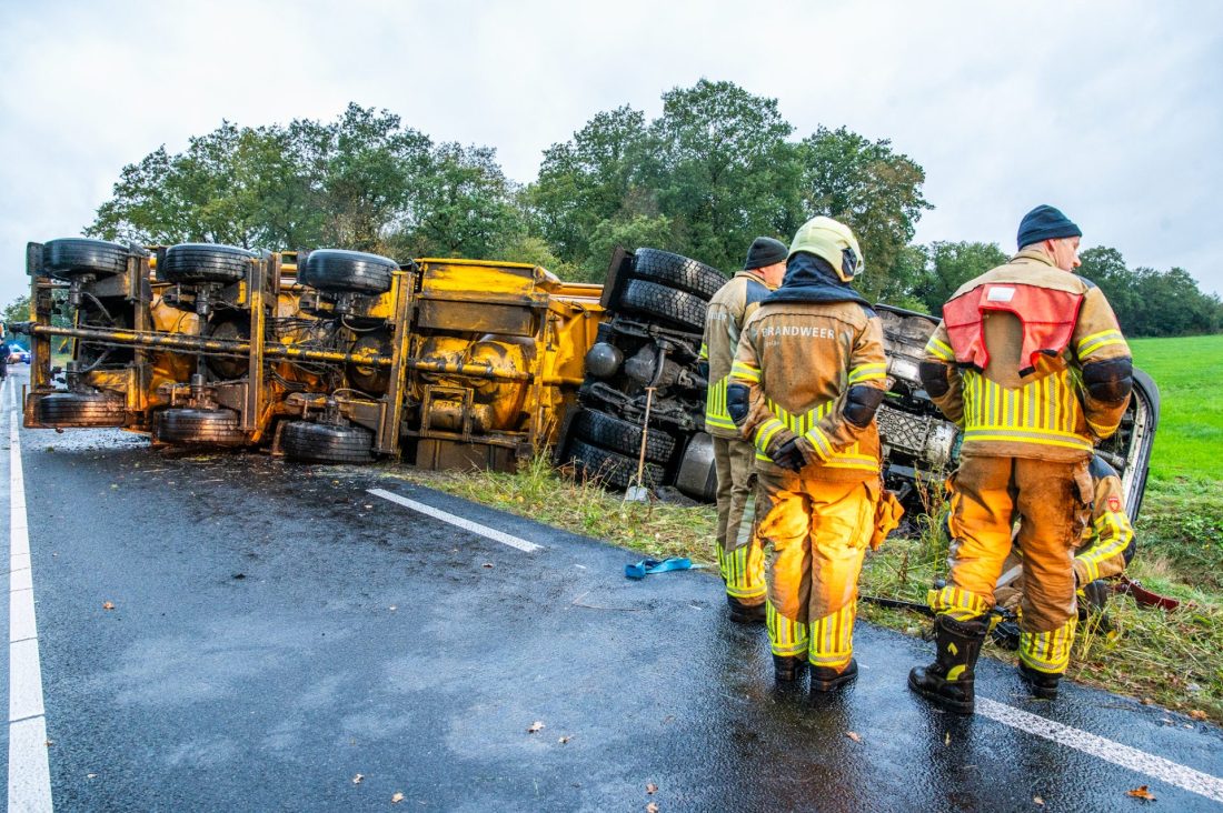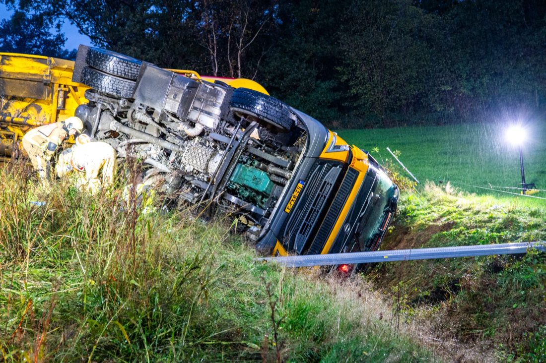 Door nog onbekende oorzaak verloor de chauffeur de controle over zijn voertuig. De truck kwam in de berm terecht, waarna zowel de trekker als de trailer op hun zijkant in de sloot belandden.