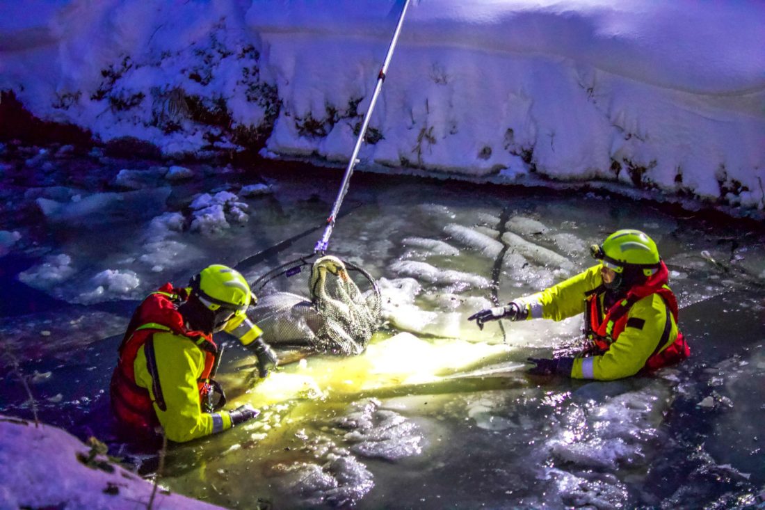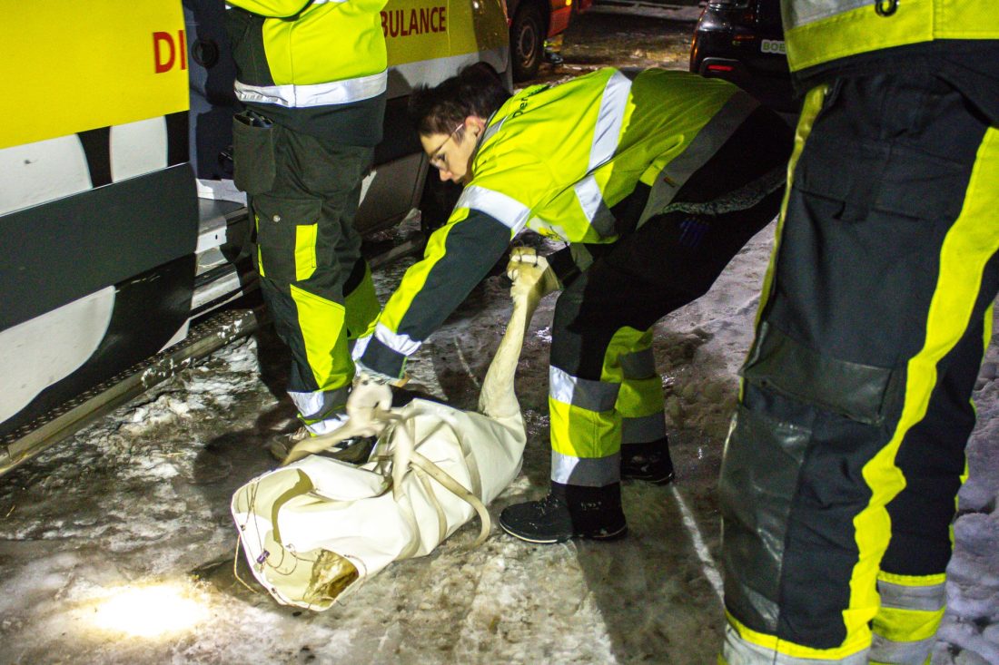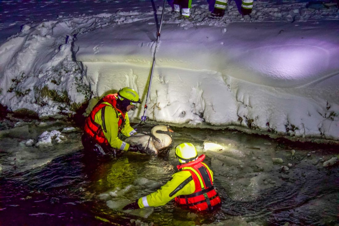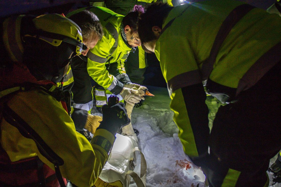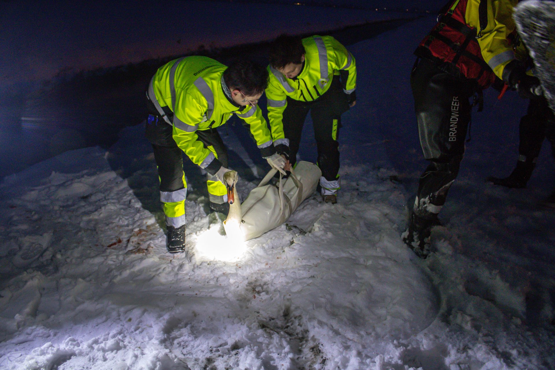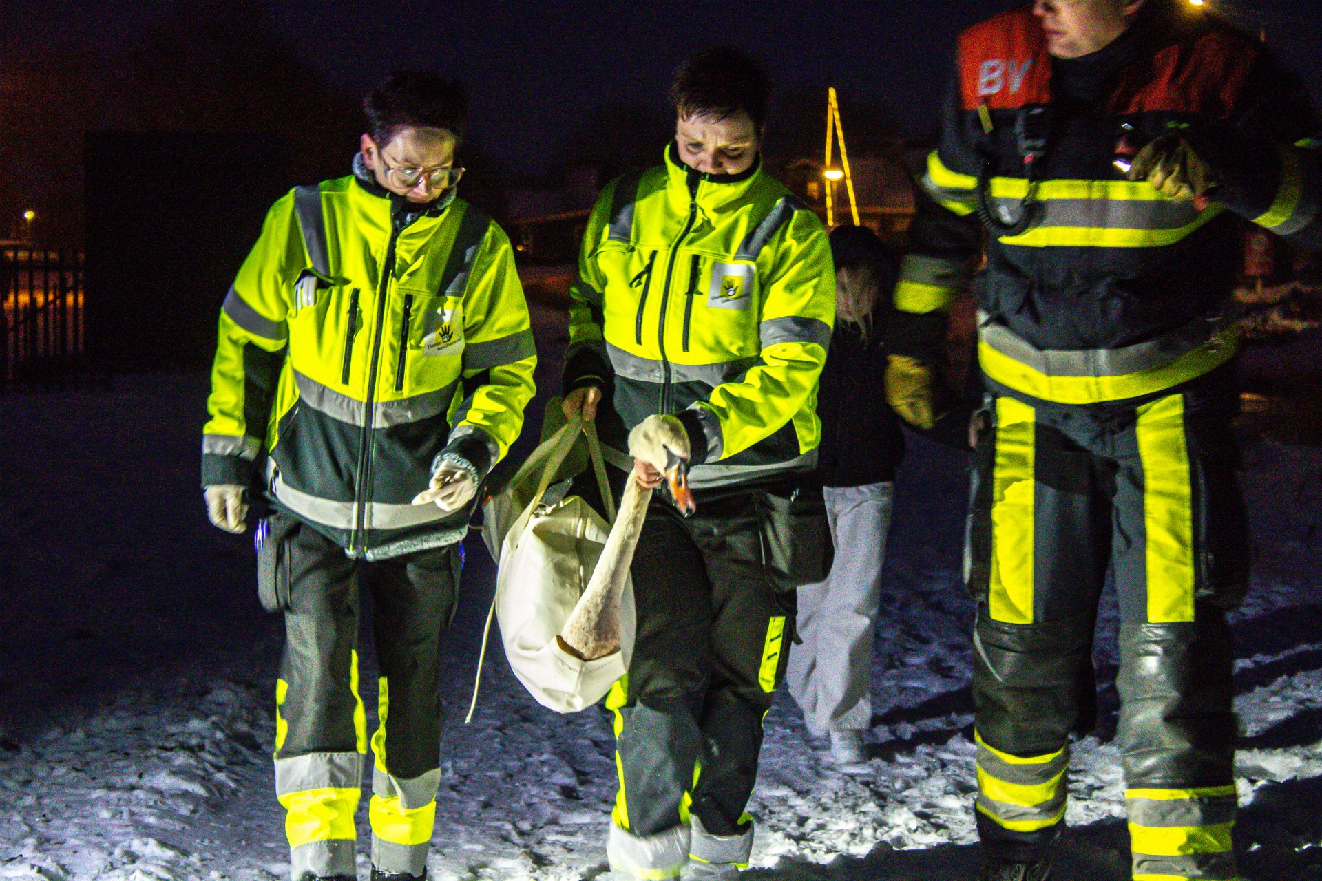 Na de redding is de zwaan overgedragen aan de dierenambulance. Zij hebben het dier meegenomen voor verdere controle en behandeling. Hoe lang de zwaan al vastzat in het ijs is niet bekend.